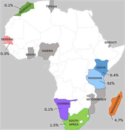 The production of marine aquatic plants in Africa is currently concentrated in Zanzibar, Tanzania, which is widely recognized as Africa’s most efficient and productive seaweed farming nation, followed by Madagascar and South Africa. Other countries, however, including Kenya, Morocco, Mozambique, Namibia and Senegal, are all still either currently producing or have previously produced seaweeds in the past few years The map below shows the countries involved in seaweed farming: