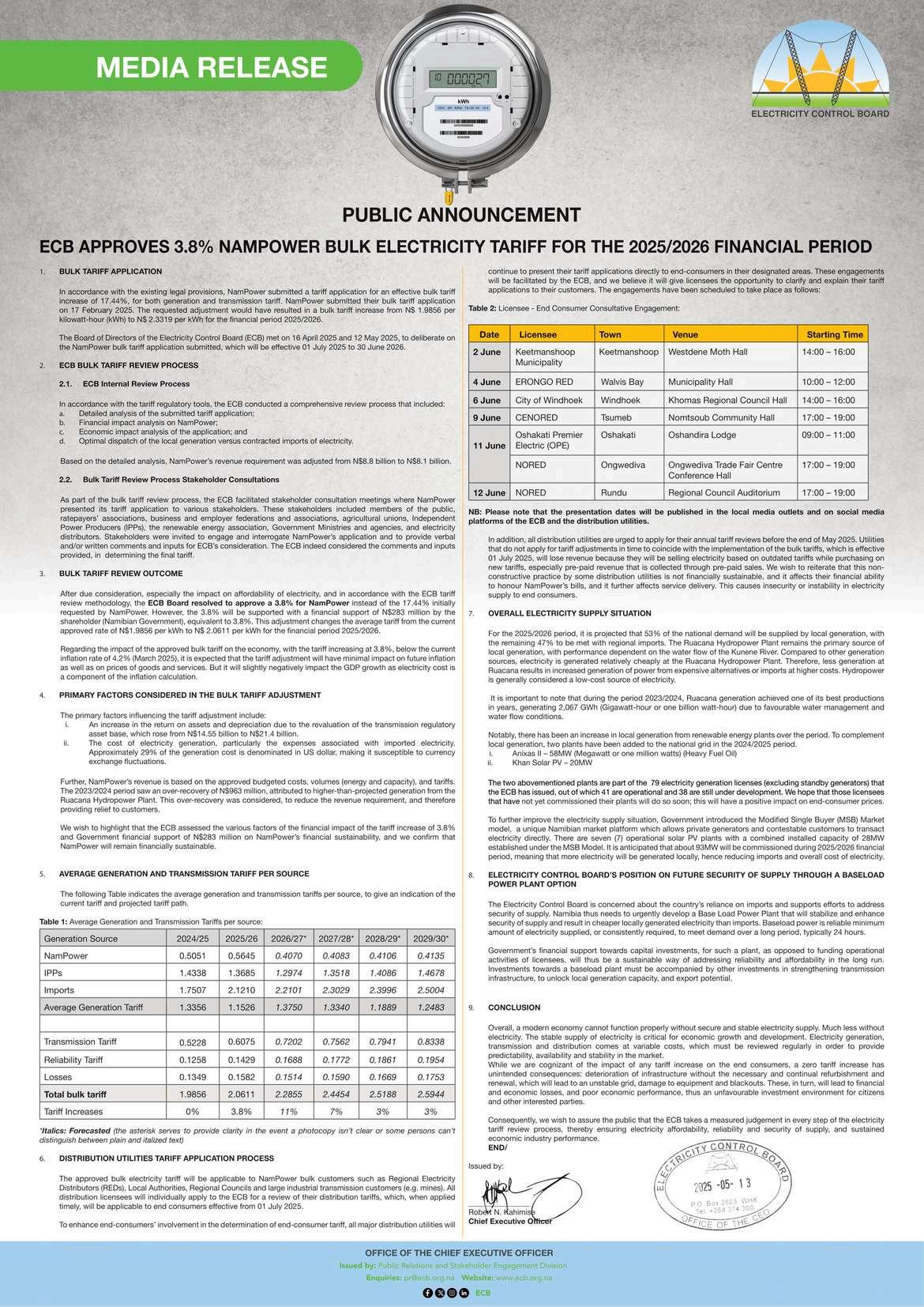 OnerecentexampleistheElectricityControlBoard(ECB)’sapprovalofa38 percent increase in the NamPower bulk electricity tariff, driven mainly by rising import costs This underscores the urgency of enhancing local electricitygeneration,whichismorecost-effective TheECBprojectsthat