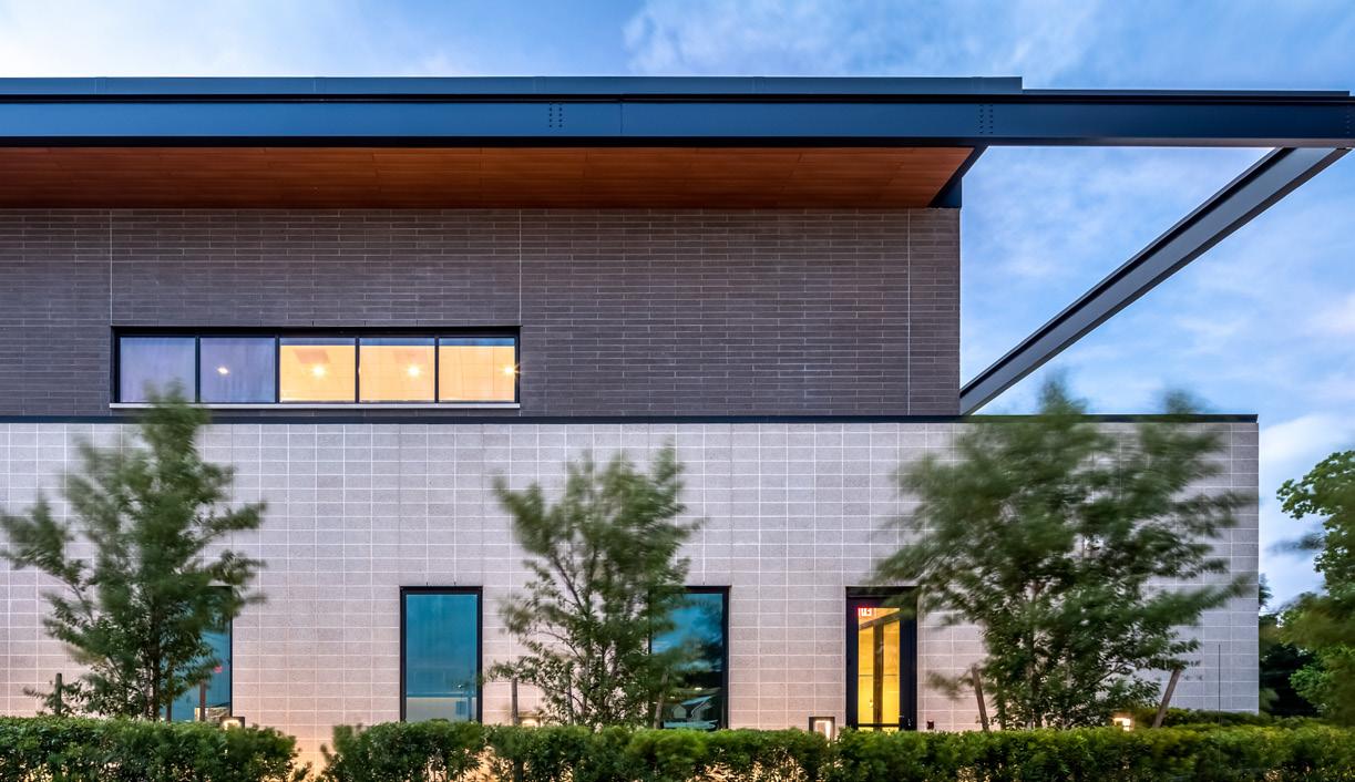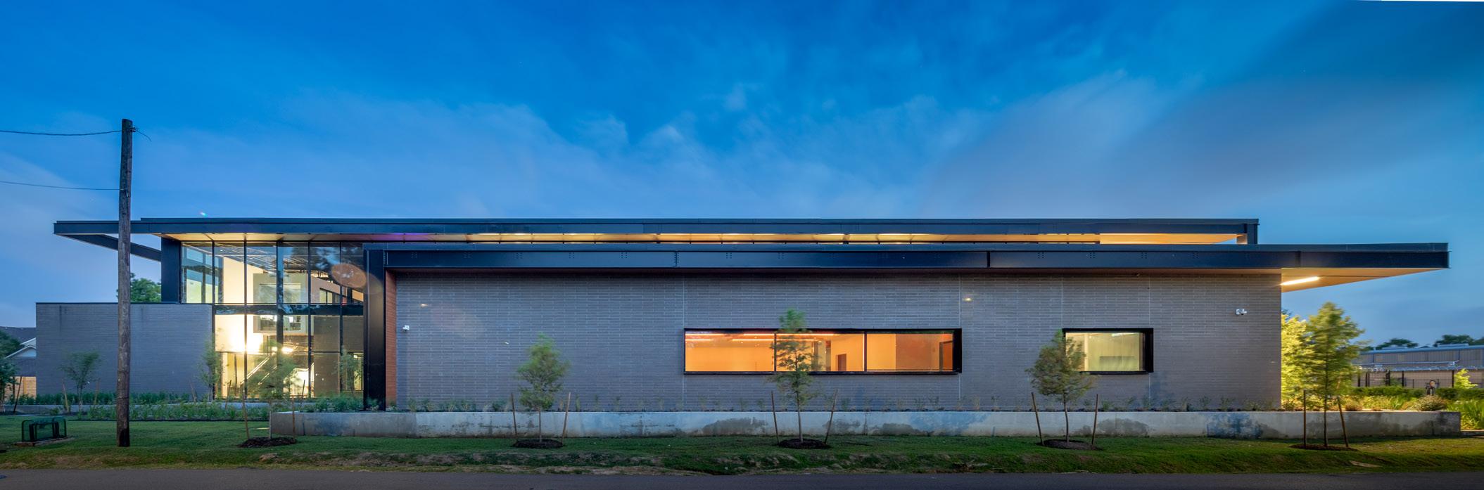 Approxiamtely half of the building footprint is a warehouse, which called for a durable and rugged material. With the two spaces being connected by a single roofline, we chose to render an elevated iteration of the warehouse CMU into the administrative space. Polished elongated units in a charcoal grey serve as the primary material, softened by a lighter stacked block & wood composite accents. The steel structure is express throughout. The facility houses field workers, and this stout materiality reflects the backbone of their labor.