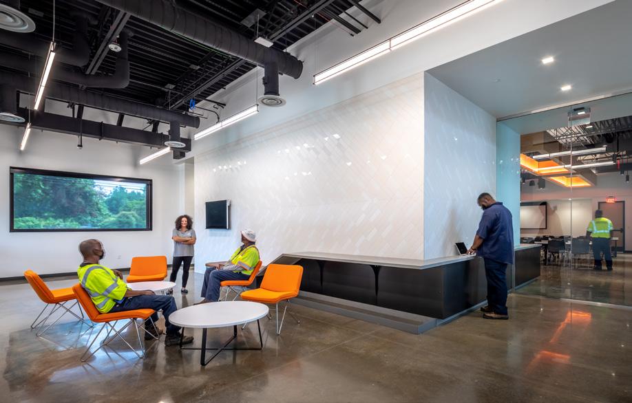 Interior concepts for the building were inspired by the everyday materials and objects one may find in the field at a PWE employee job site; traffic cone orange, concrete, headlights, manhole covers, steel pipe, bolts.
