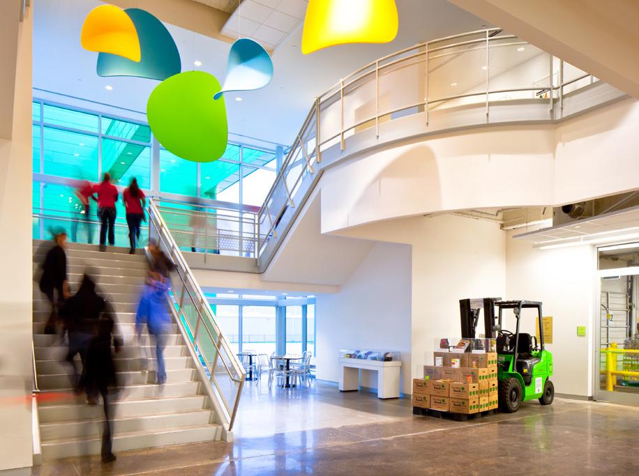 Through exposed structure and creative use of materials, food bank spaces are efficient, playful, and reinforce the overall mission.