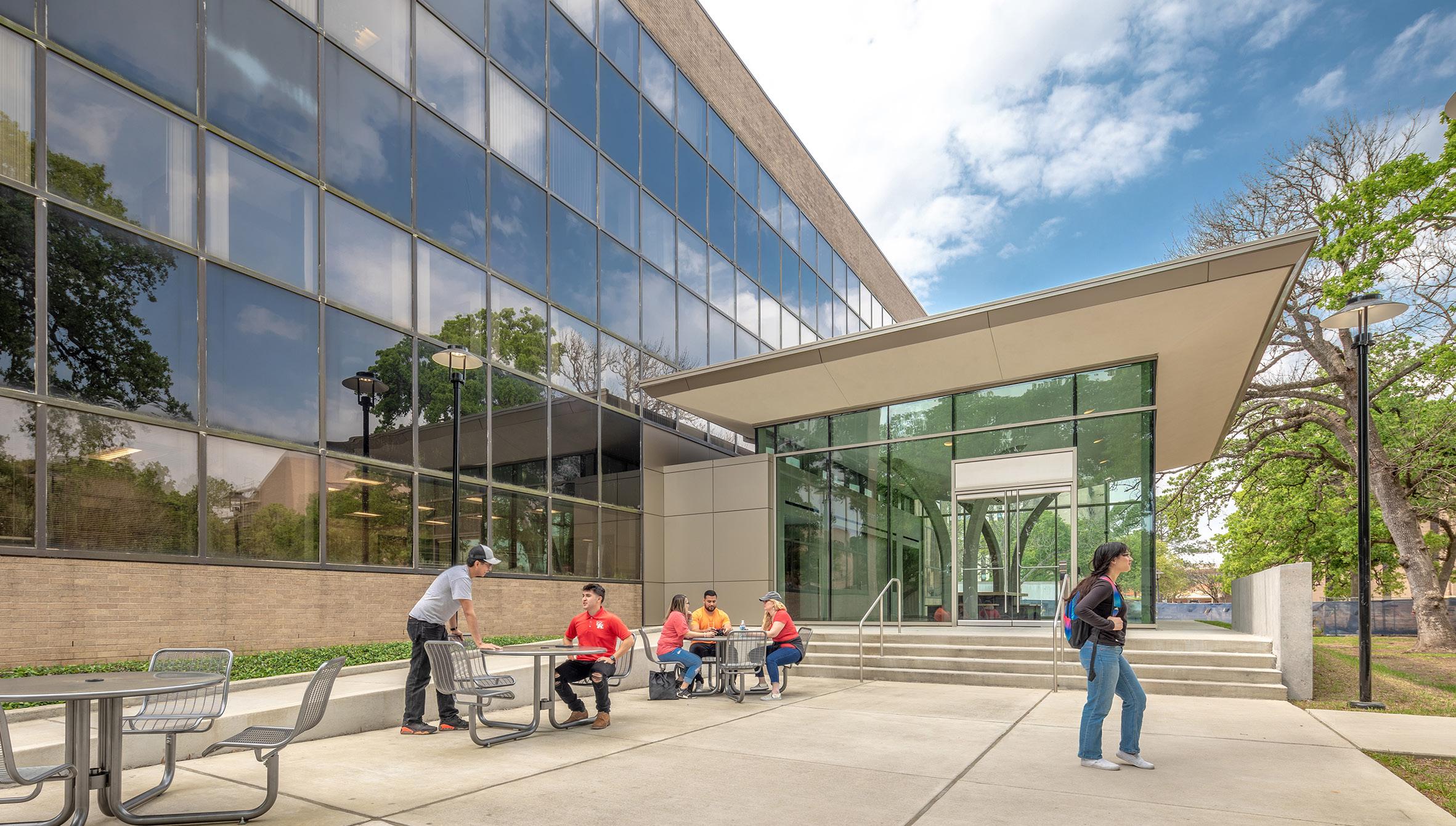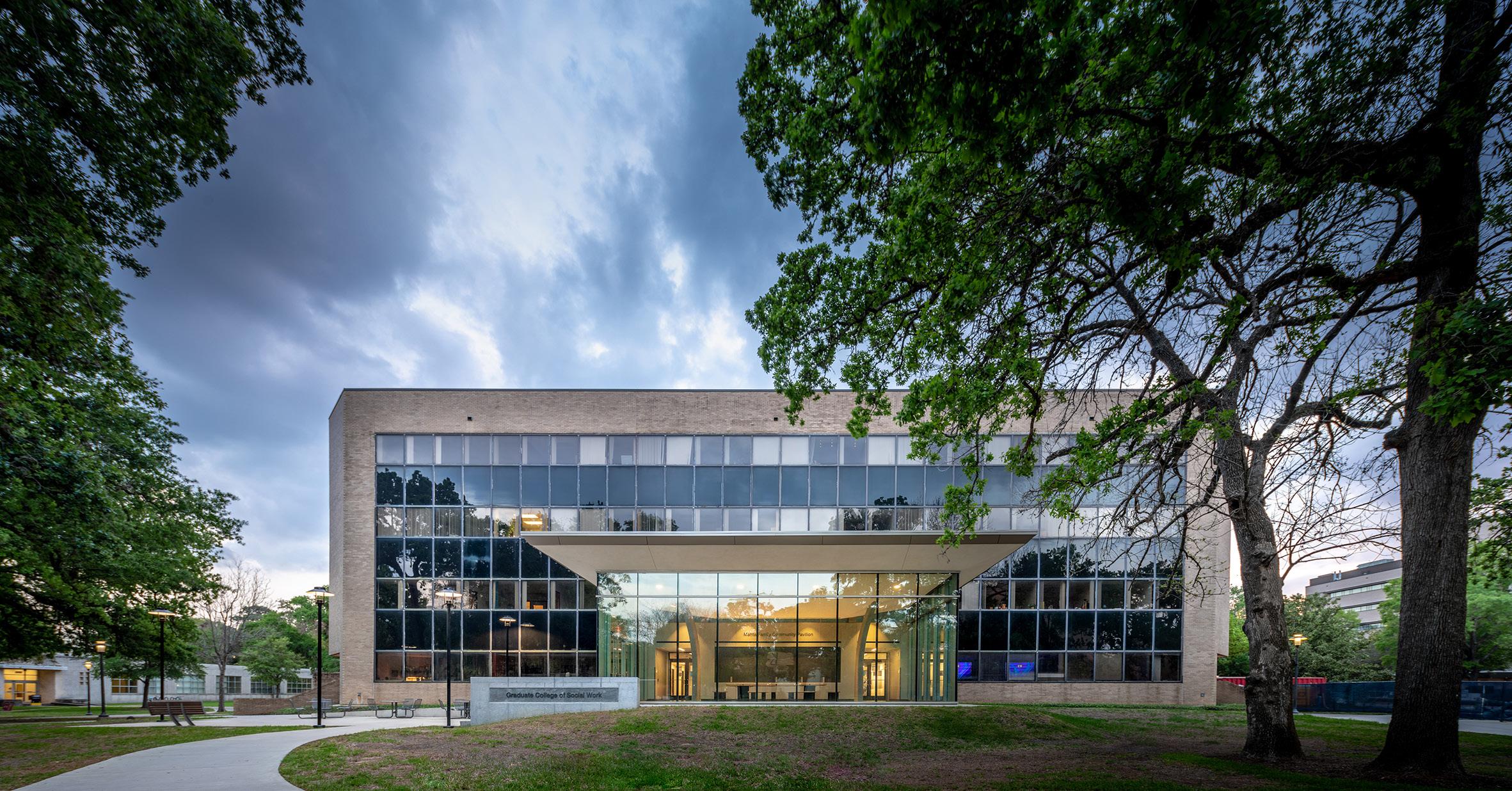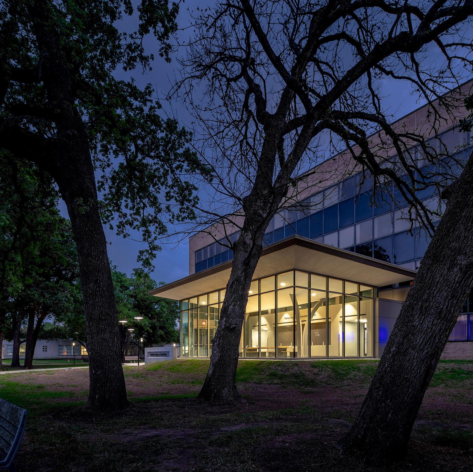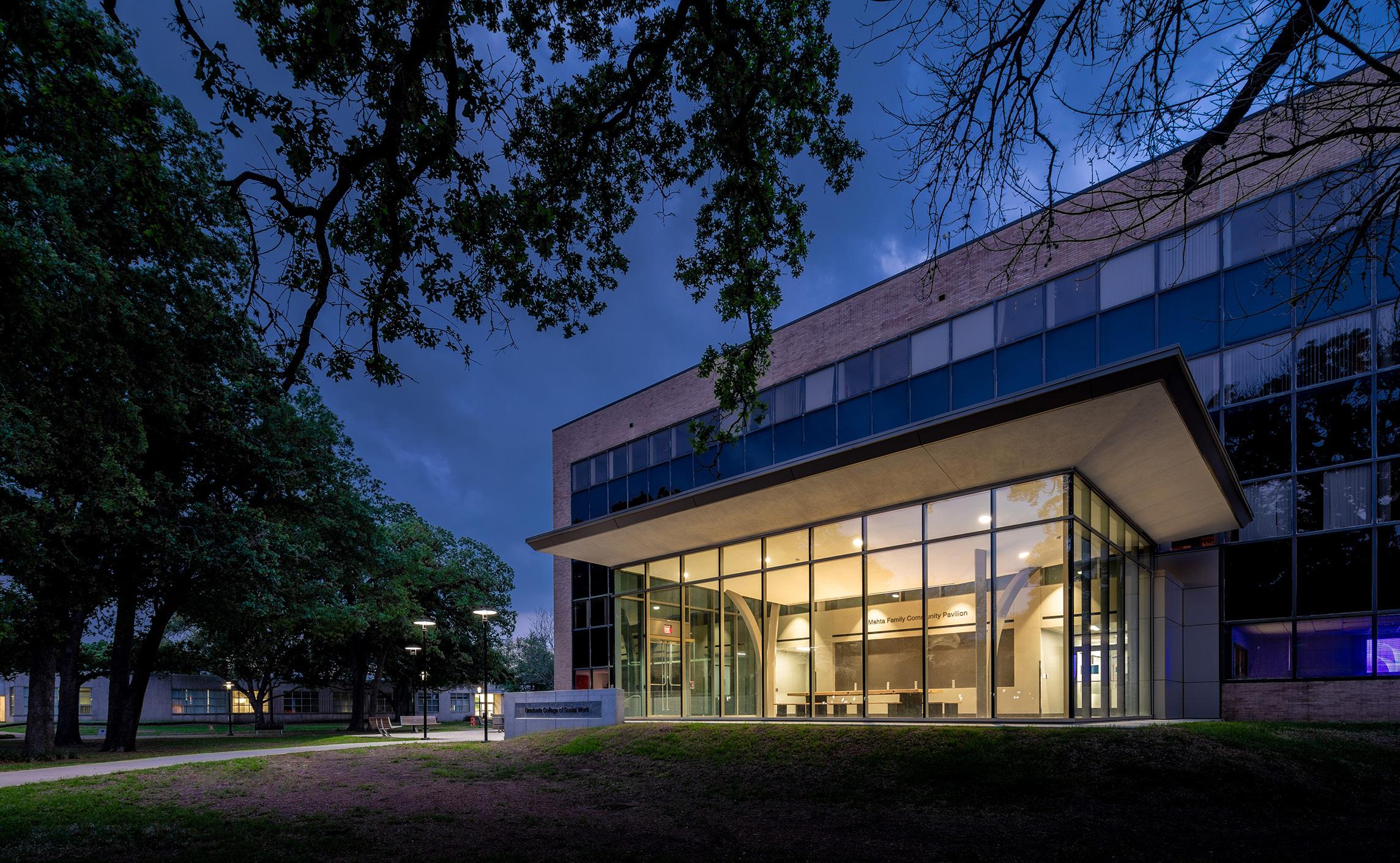 The main feature of the renovated building is the grand entrance of the new Mehta Family Community Pavilion, which features an open and welcoming design that adds a modern style and character to the previously nondescript exterior. The space, dedicated to the work done by the faculty and students, celebrates the continuous impact graduates of the program have made in Texas and beyond.