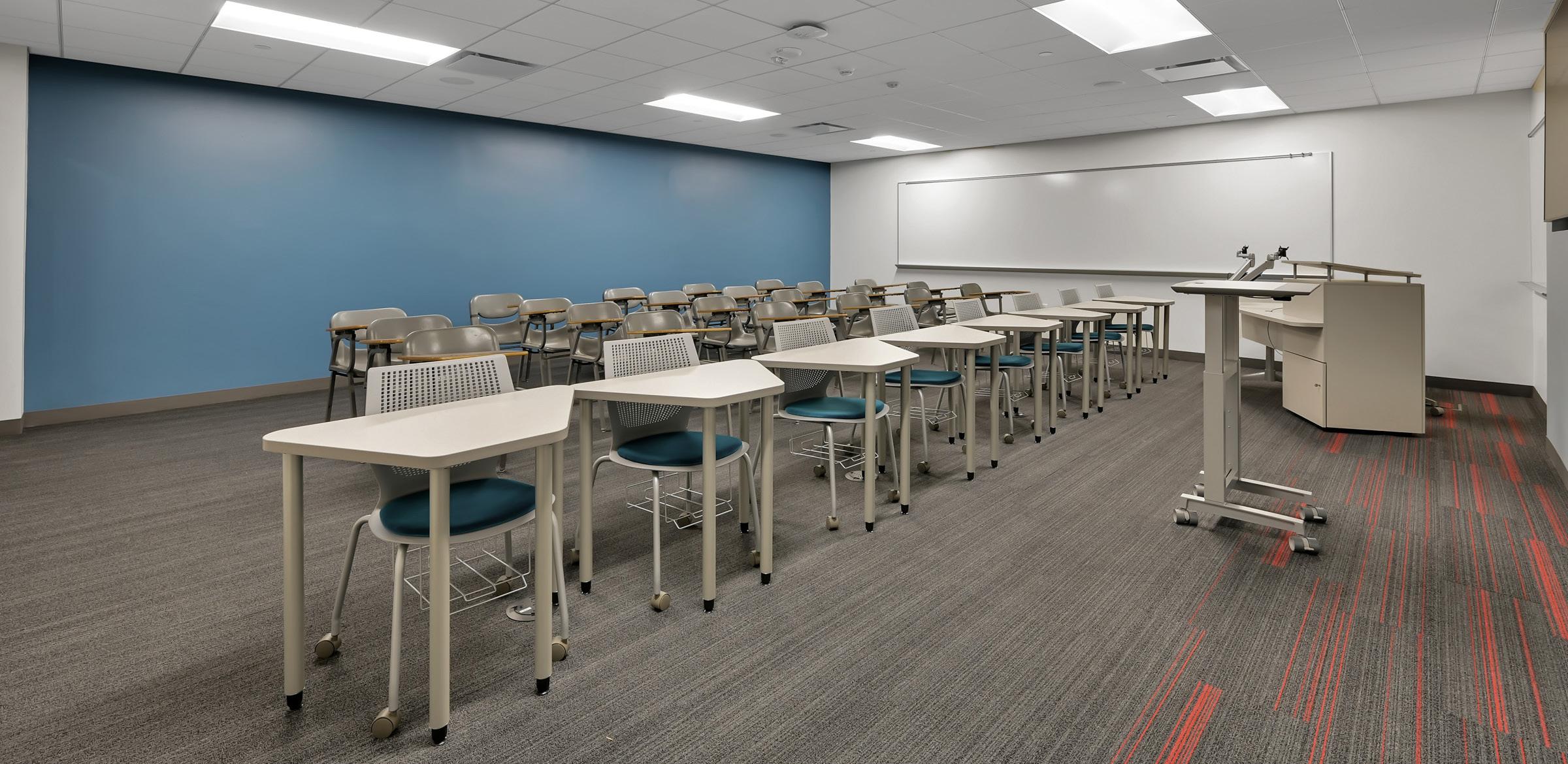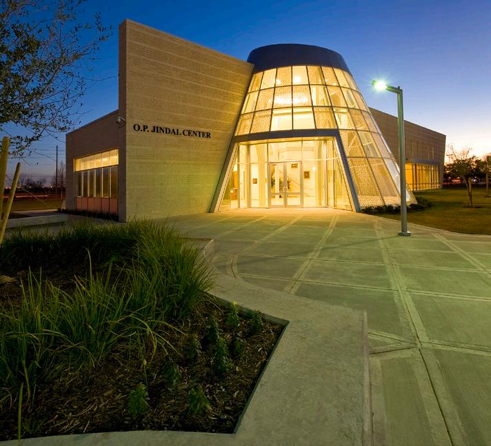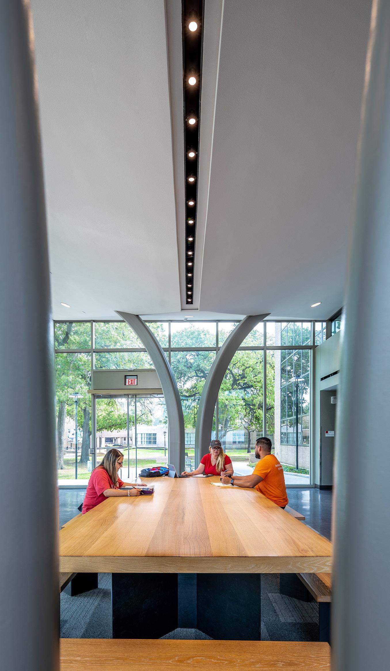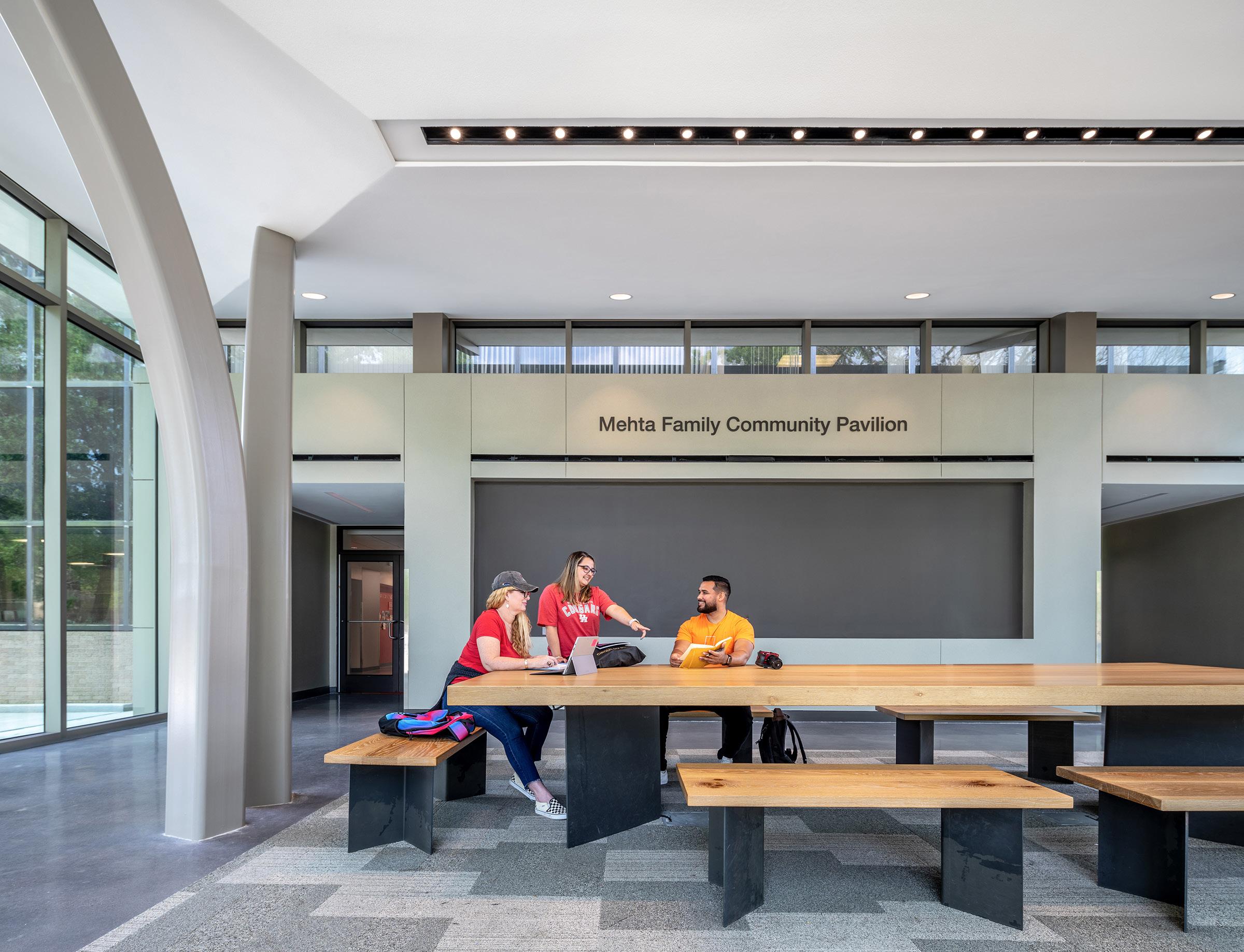 The main feature of the renovated building is the grand entrance of the new Mehta Family Community Pavilion, which features an open and welcoming design that adds a modern style and character to the previously nondescript exterior. The space, dedicated to the work done by the faculty and students, celebrates the continuous impact graduates of the program have made in Texas and beyond.
