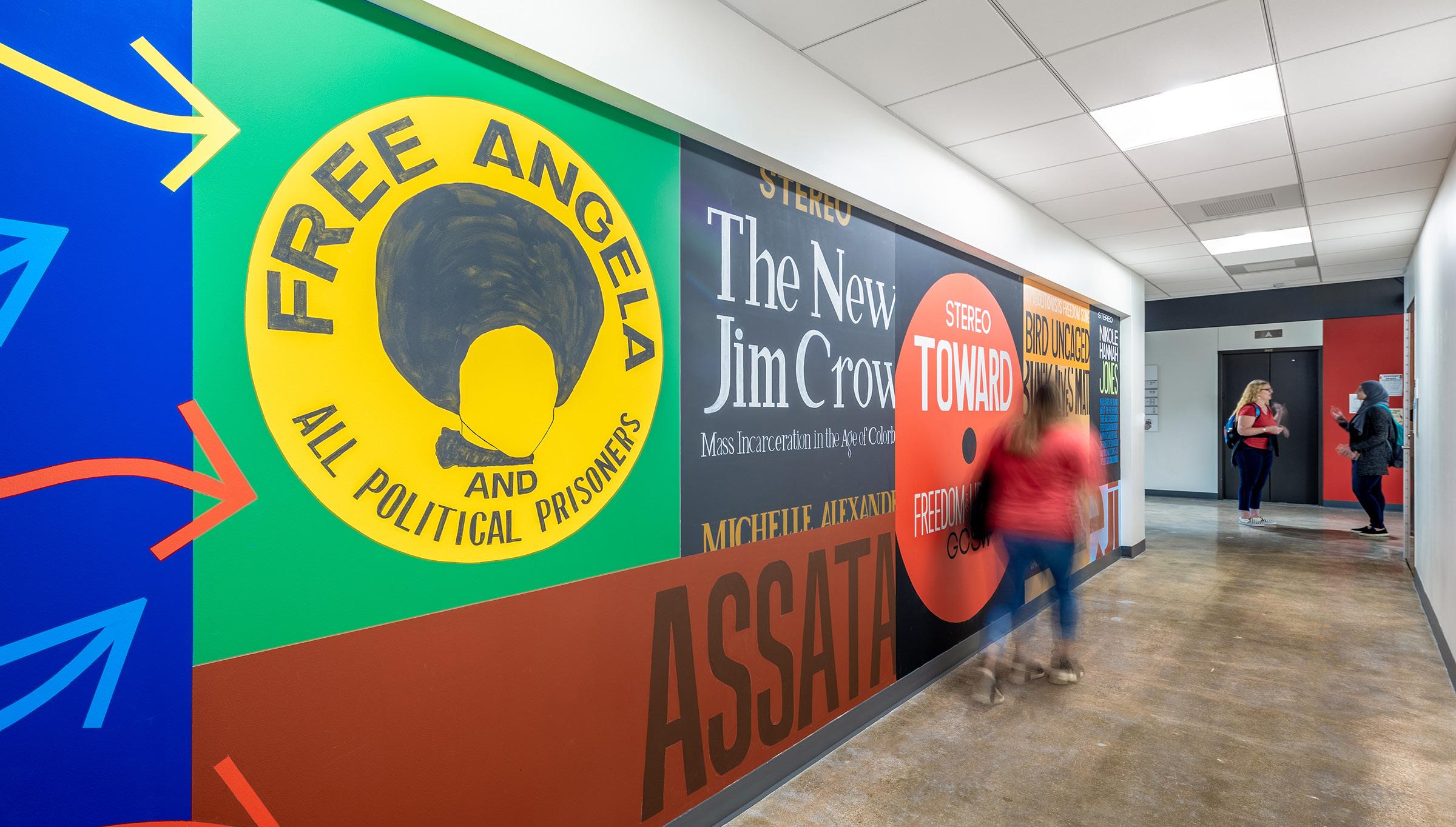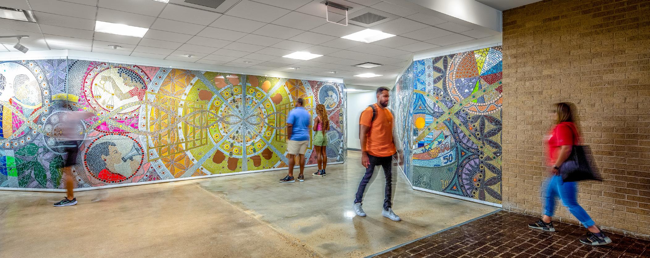The faces featured within the mural are based on the likenesses of actual students, faculty, and alumni of the college. The mural has become its own character in the story of the Graduate College of Social Work, serving as part greeter, historian, storyteller, facilitator of belonging, and a reminder of our mission and the important work to be done together.