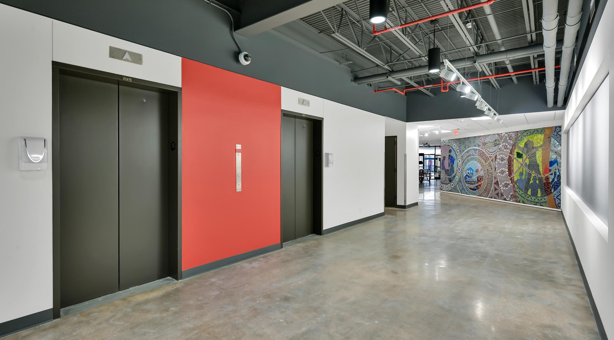 Visitors soon encounter the large colorful mural facing the building’s former primary entrance. Designed by renowned artist Reginald C. Adams, the theme of the new mural is “Pulling Together” and the artwork depicts people pulling on chains connected to a door. The door is meant to symbolize new doors of possibility and the chains represent the struggles that we all face in life. Broken glass mirrors are meant to reflect the viewer, showing that although we are imperfect, we can all have equal opportunities once that door opens.