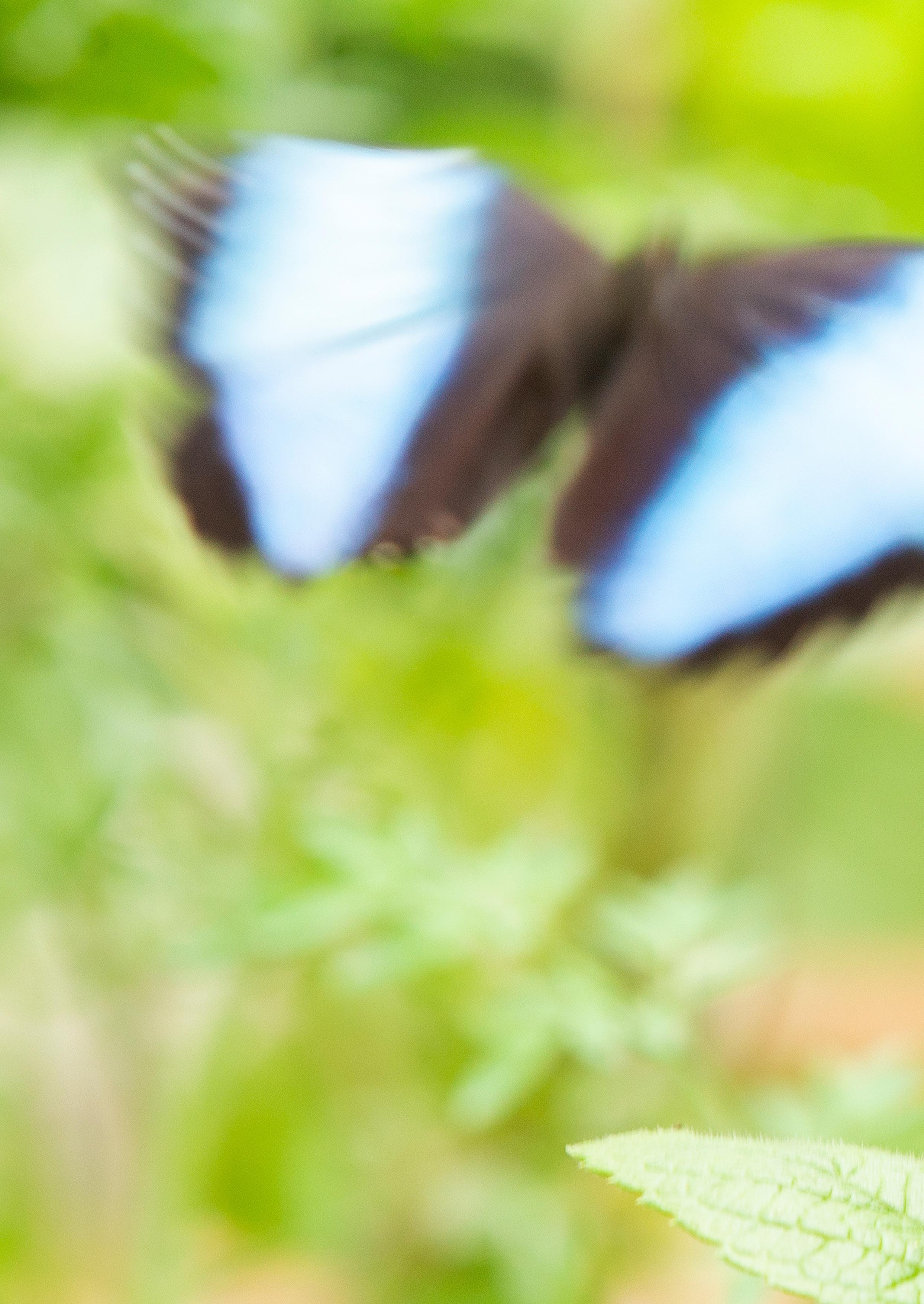 ejemplares que pueden superar los 20 centímetros con sus alas abiertas. Todo el ciclo de vida de la Morpho Azul, desde su huevo hasta su muerte de adulto alcanza entre 115 y 120 días, dependiendo de su alimentación, sus condiciones de vida y los posibles depredadores.