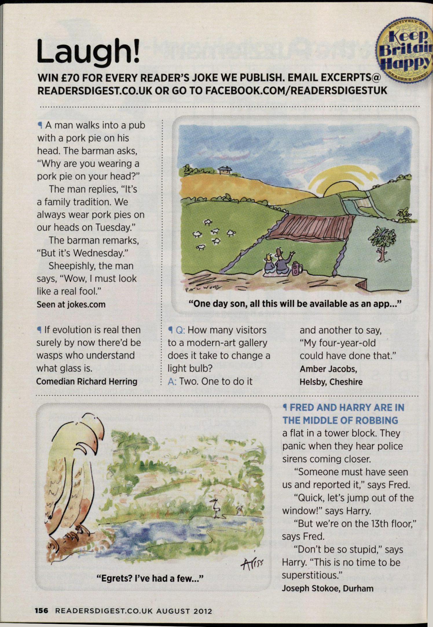 caption from our professional cartoonist. Visitors can choose their favourite—and if your entry gets the most votes, you'll receive £100 and a framed copy of the drawing. Submit to captions@readersdigest.co.uk or the address on page 4 by August 10. Enter and vote online at readersdigest.co.uk/caption. We'll announce the winner in our October issue. •