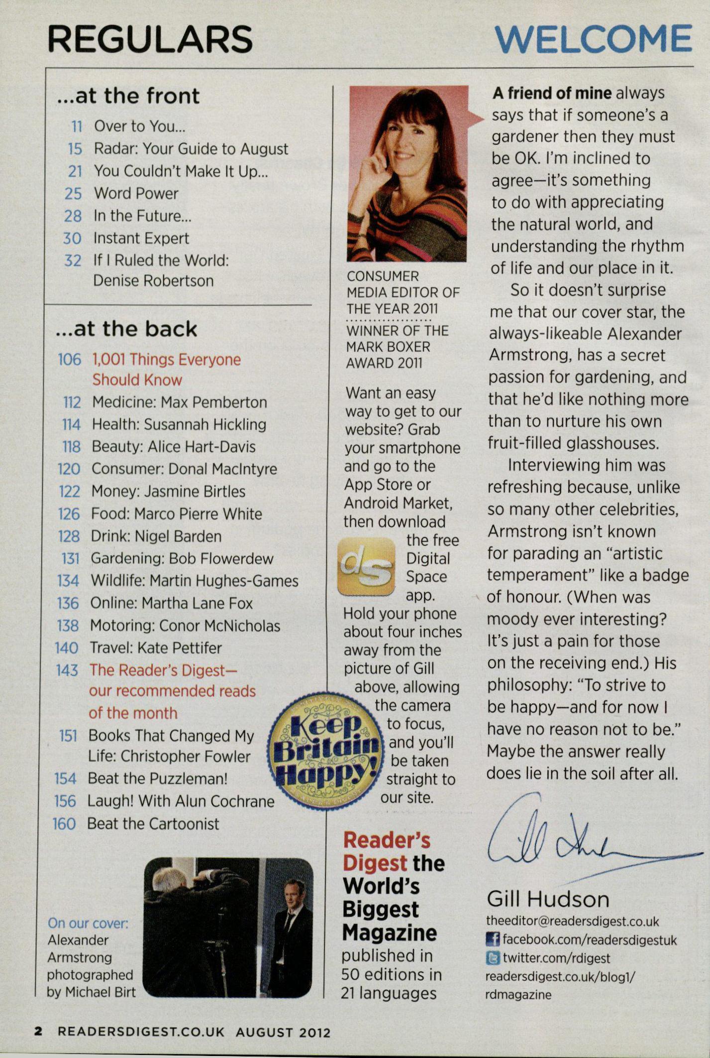 Want an easy way to get to our website? Grab your smartphone and go to the App Store or Android Market, then download the free Digital Space app. Hold your phone about four inches away from the picture of Gill above, allowing the camera to focus, and you'll be taken straight to our site. Reader's Digest the World's Biggest Magazine published in 50 editions in 21 languages