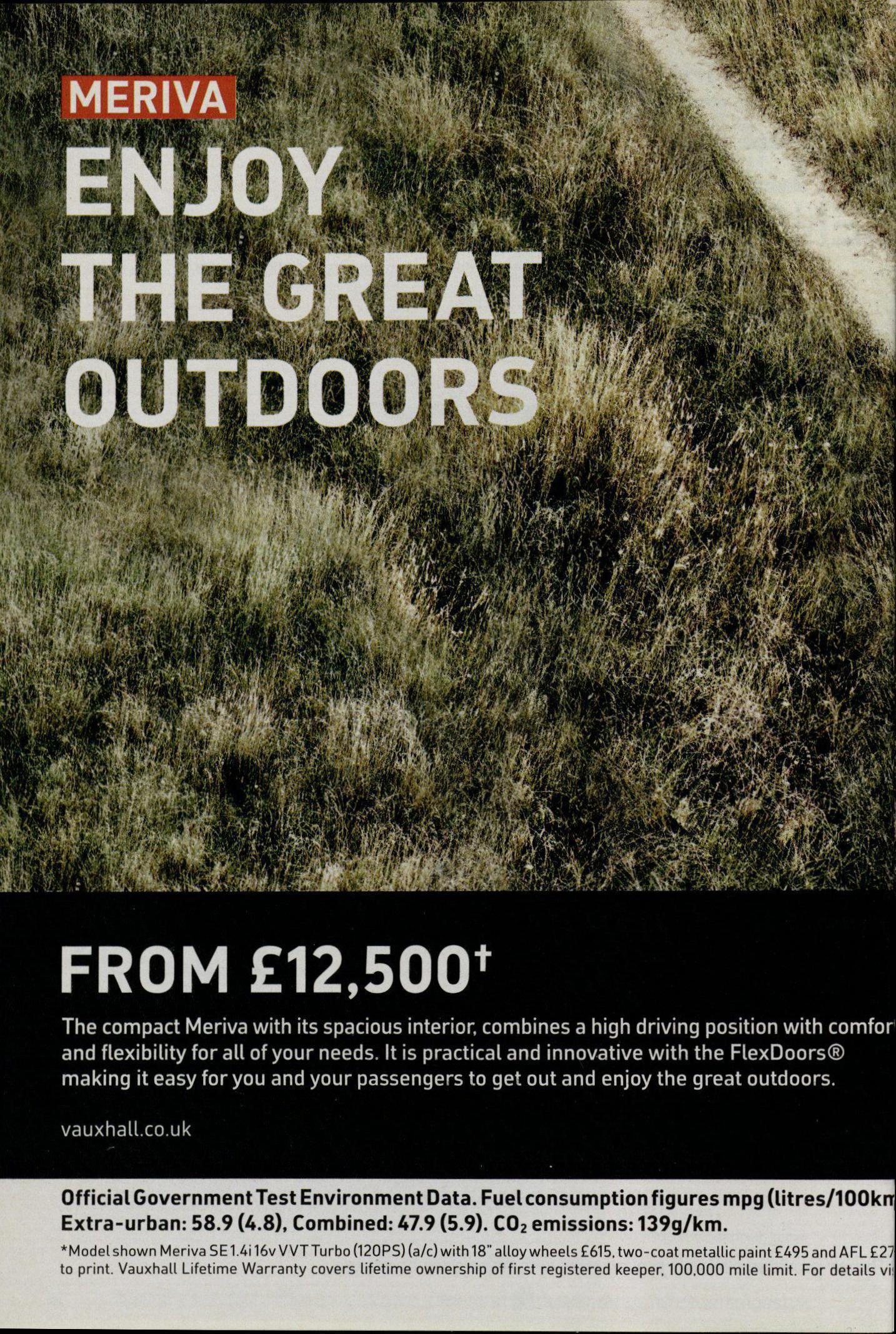vauxhall co uk FROM £12,500t The compact Meriva with its spacious interior, combines a high driving position with comfor and flexibility for all of your needs. It is practical and innovative with the FlexDoors® making it easy for you and your passengers to get out and enjoy the great outdoors.