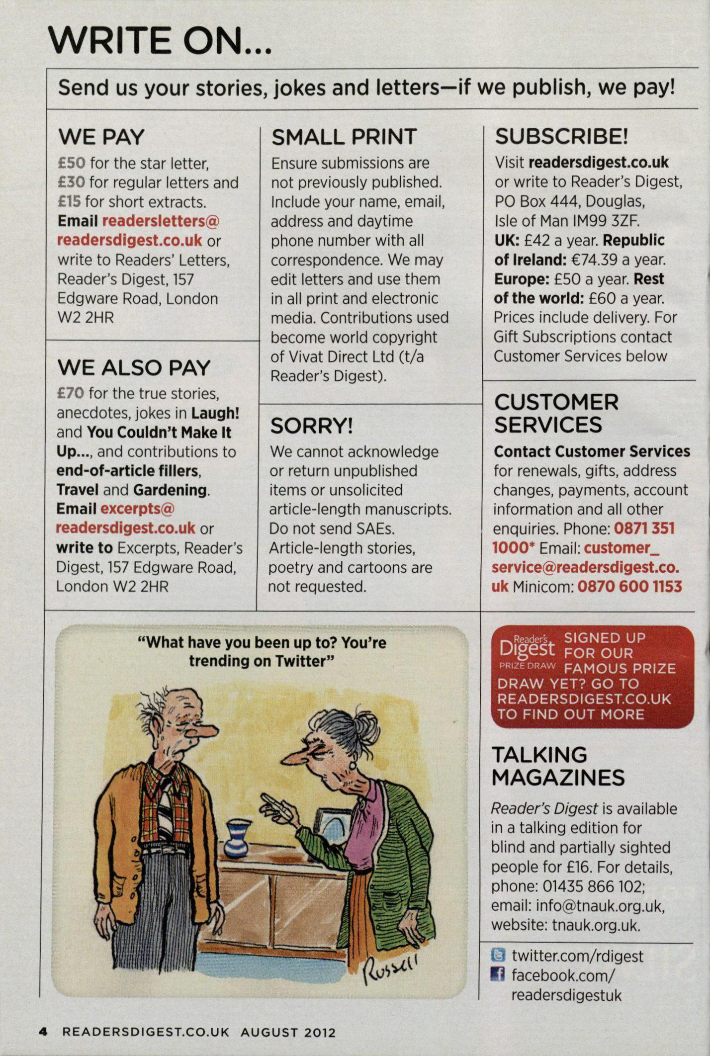 Visit readersdigest.co.uk or write to Reader's Digest, PO Box 444, Douglas, Isle of Man