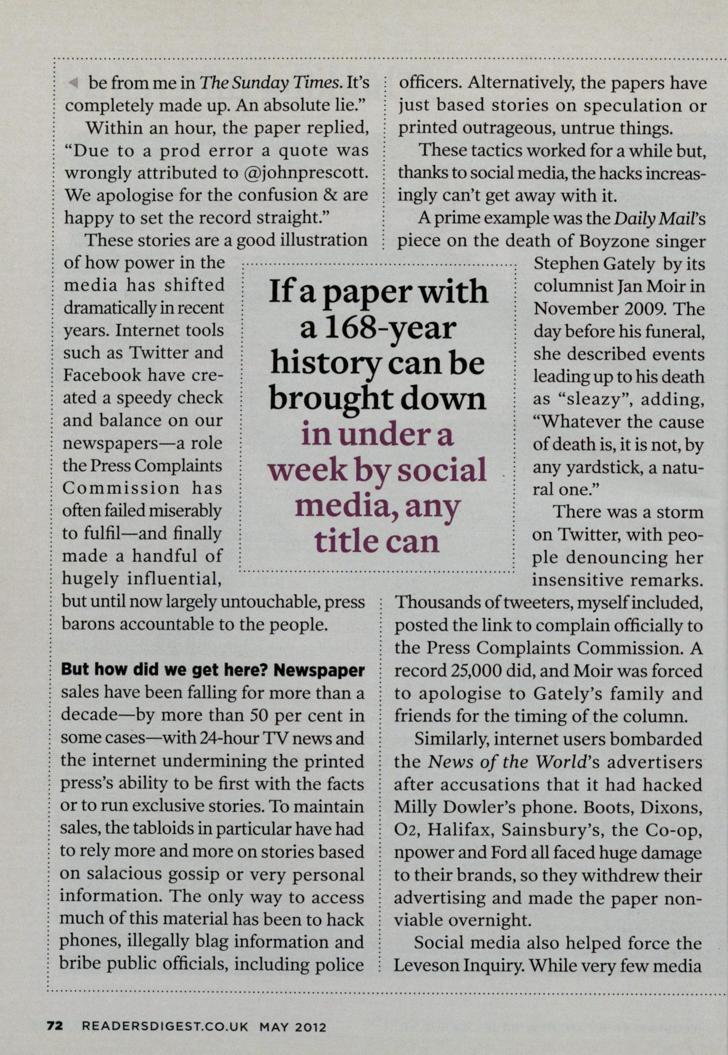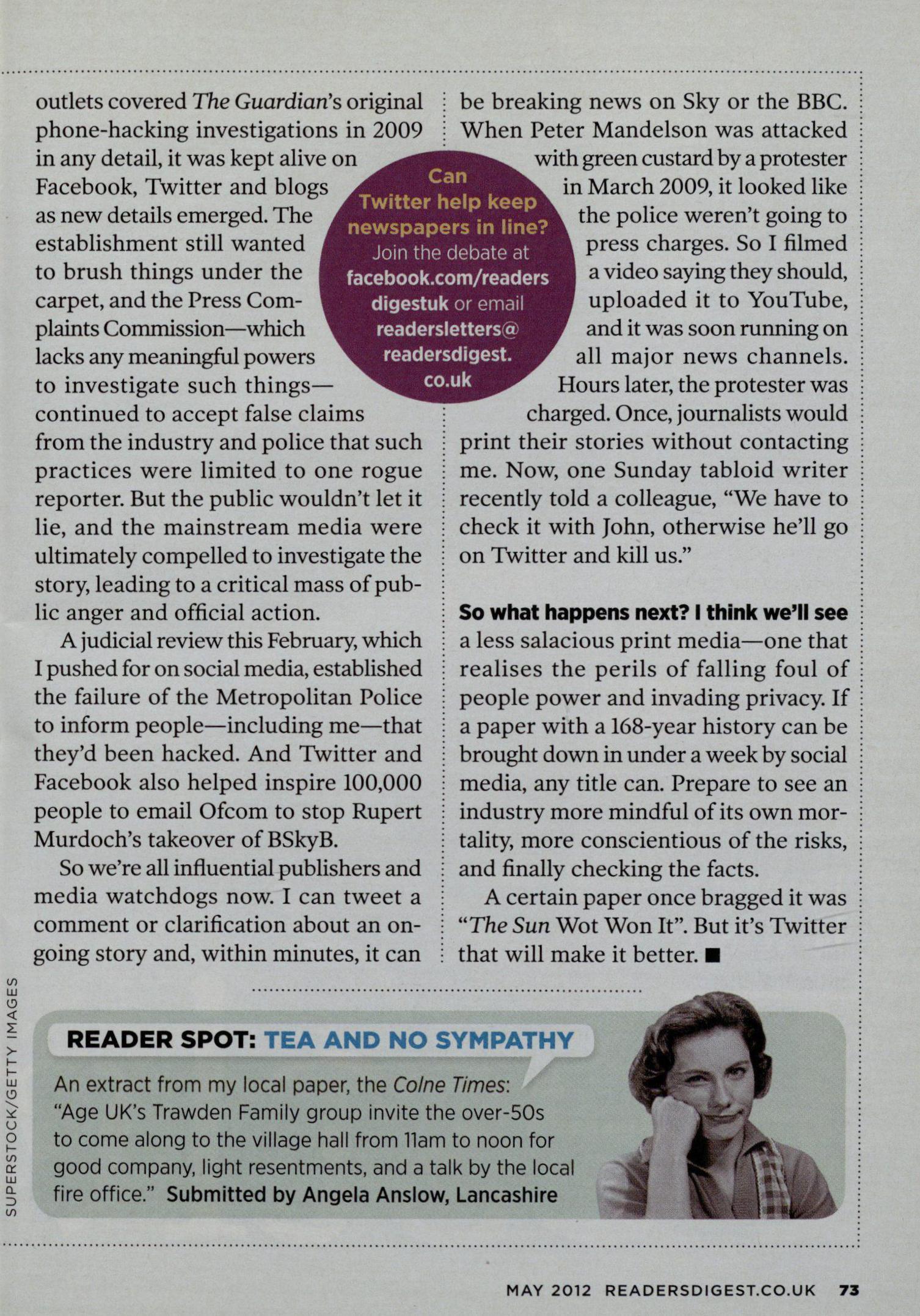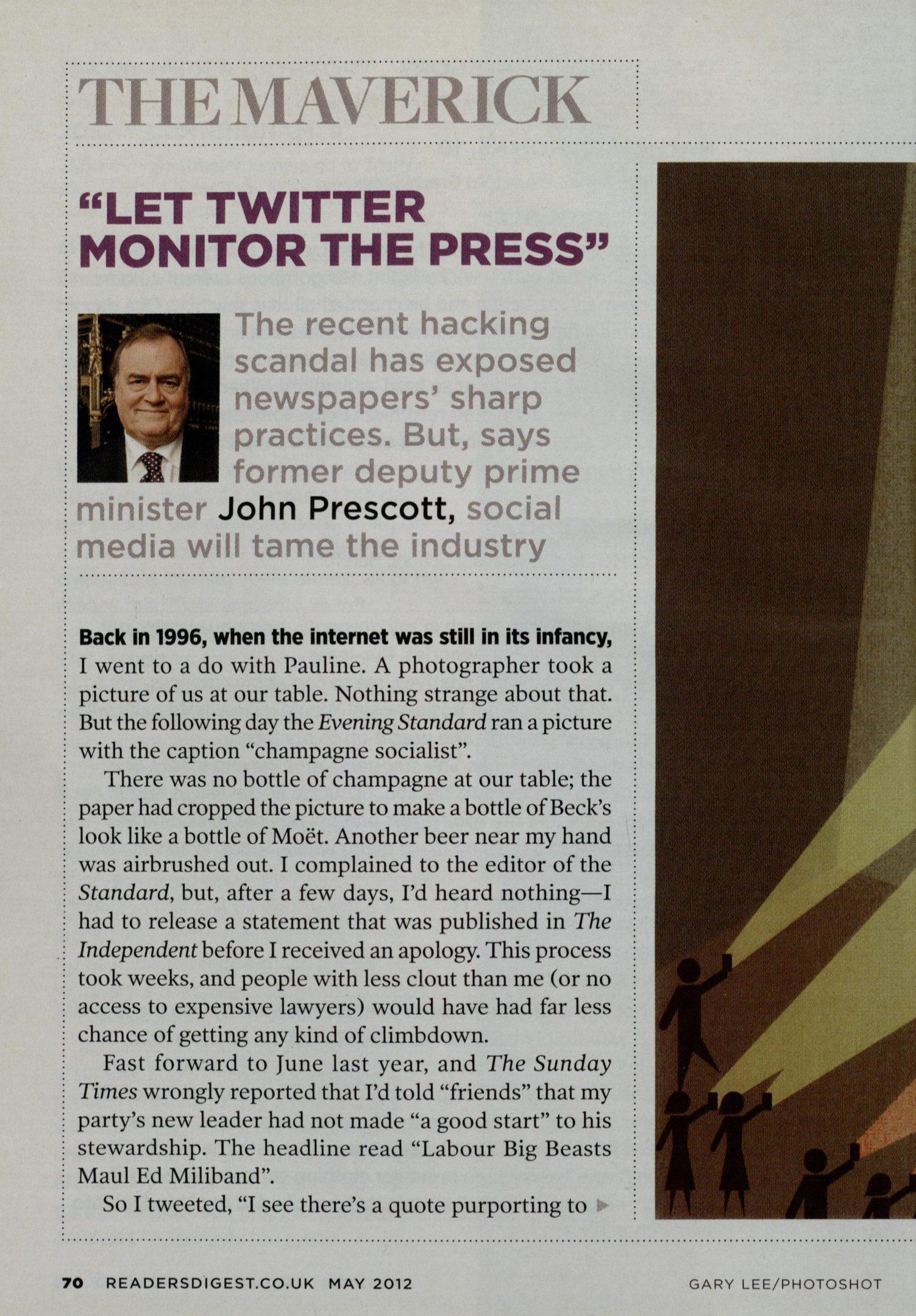 "It's a honour to write for Reader's Digest," says John Prescott. "When I was a seaman, I'd spend many a night reading it. My article looks at how social media is holding the press to account."