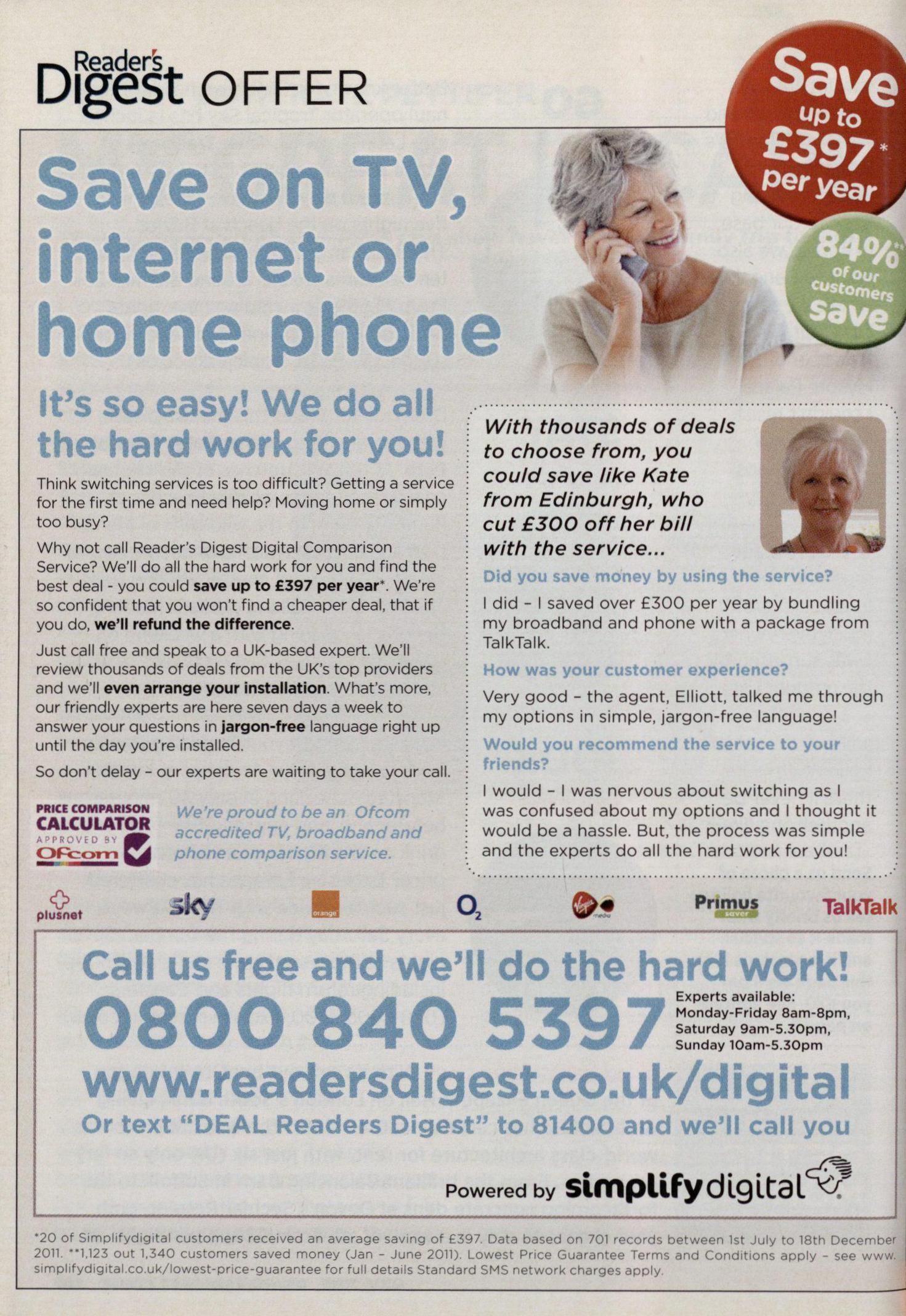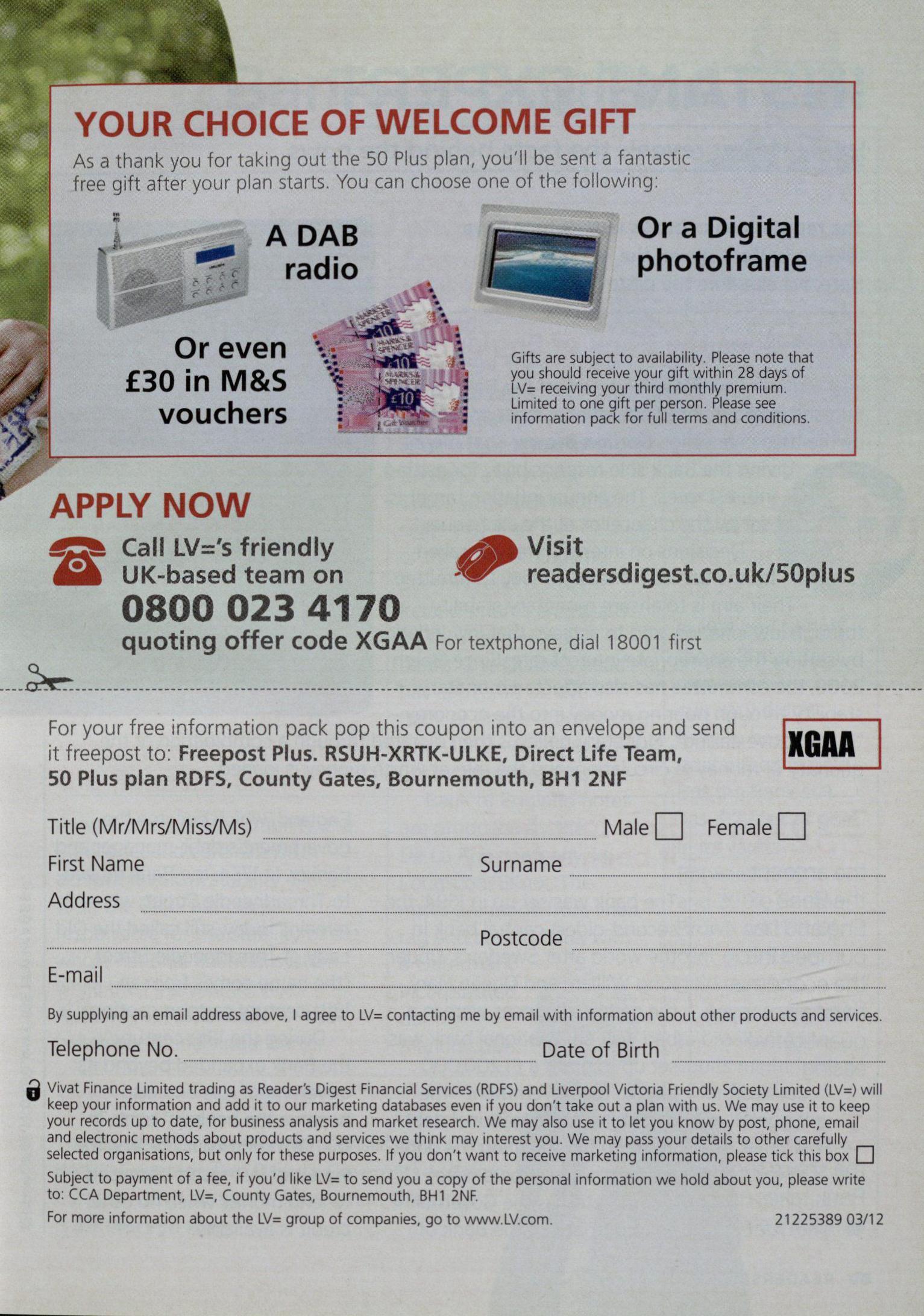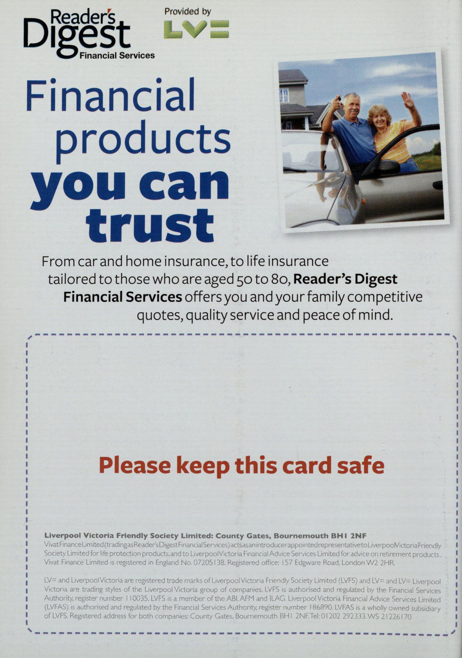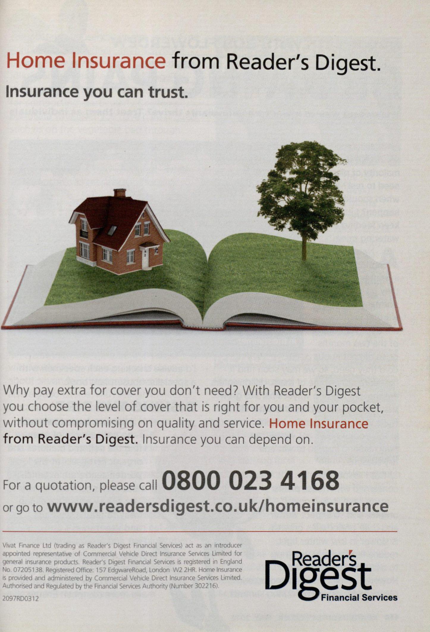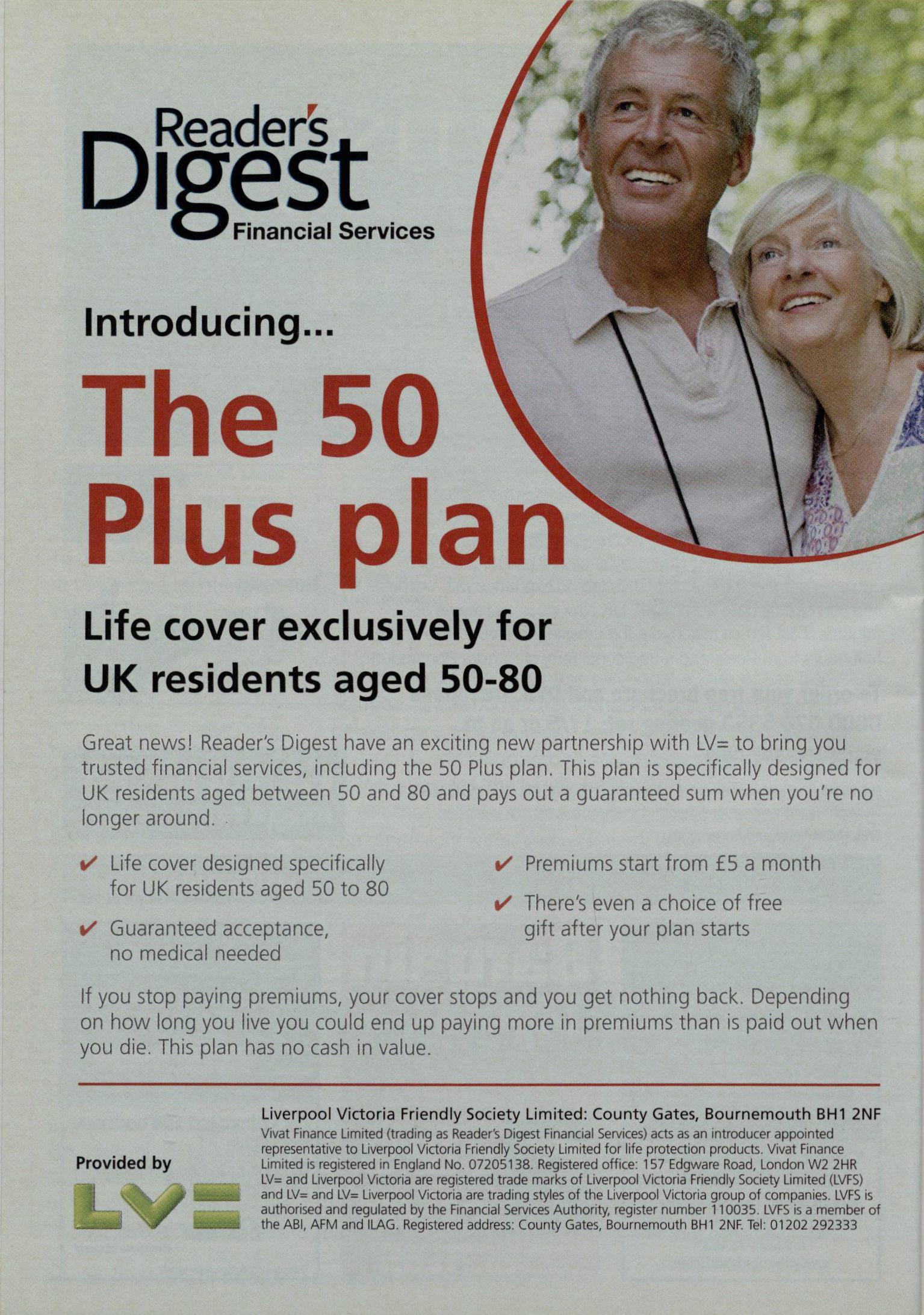 0800 023 4170 Or visit us online at: www.readersdigest.co.uk/50plus Provided by LV=. Lines open 8am-8pm Mon-Fri, 8am-4pm Sat Annuities Call FREE on: 0800 023 4186 Or visit us online at: www.readersdigest.co.uk/annuities Provided by LV=. Lines open 9am-8pm Mon-Thur, 9am-5pm Fri * For textphone, dial 18001 first. We may record and/or monitor calls for training and audit purposes. Equity release Call FREE on: 0808 252 9704 Or visit us online at: www.readersdigest.co.uk/equityrelease Provided by Equity Release Assured Lines open 9am-5.30pm Mon-Fri Car Insurance Call FREE on: Readers Digest Financial Services Provided by Financial products you can trust Two trusted brands working together to bring you one source of reliable, jargon-free financial products. Liverpool Victoria Friendly Society Limited: County Gates, Bournemouth BH 1 2NF Vivat Finance Limited (trading as Reader's Digest Financial Services) acts as an introducer appointed representative to Liverpool Victoria Society Limited for life protection products, and to Liverpool Victoria Financial Advice Services Limited for advice on retirement products VIVat Finance Limited is registered in England No. 07205138. Registered office: 157 Edgware Road. London W2 2HR LVa and Liverpool Victoria are registered trade marks of Liverpool Victoria Friendly Society Limited (LVFS) and LV= and LV= Liverpool Victoria are trading styles of the Liverpool Victoria group of companies. LVFS is authorised and regulated by the Financial Services Authority, registeiwaben 110035. LVFS is a member of the AB!. AFM and ILAG. Liverpool Victoria Financial Advice Services Limited (LVFAS) is authorised and rated by the Financial Services Authority, register number 186890. LVFAS is a wholly owned subsidiary of LVFS. Registered address for both companies: County Gates, Bournemouth BH I 2NE Tel. 0I 202 292333. VVS21226737 Call now © or go online sfej 50 Plus life insurance Call FREE on: 0800 023 4148 Or visit us online at: www.readersdigest.co.uk/carinsurance Provided by Brightside. Lines open 9am-8pm Thurs, 9am to 7pm Fri, 9am to 1pm Sat Home Insurance Call FREE on: 0800 023 4168 Or visit us online at: www.readersdigest.co.uk/homeinsurance Provided by Brightside. Lines open 9am-5pm Mon-Fri, 9am to 1pm Sat