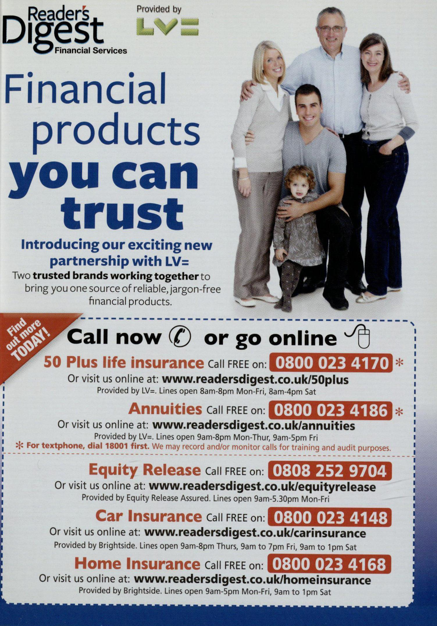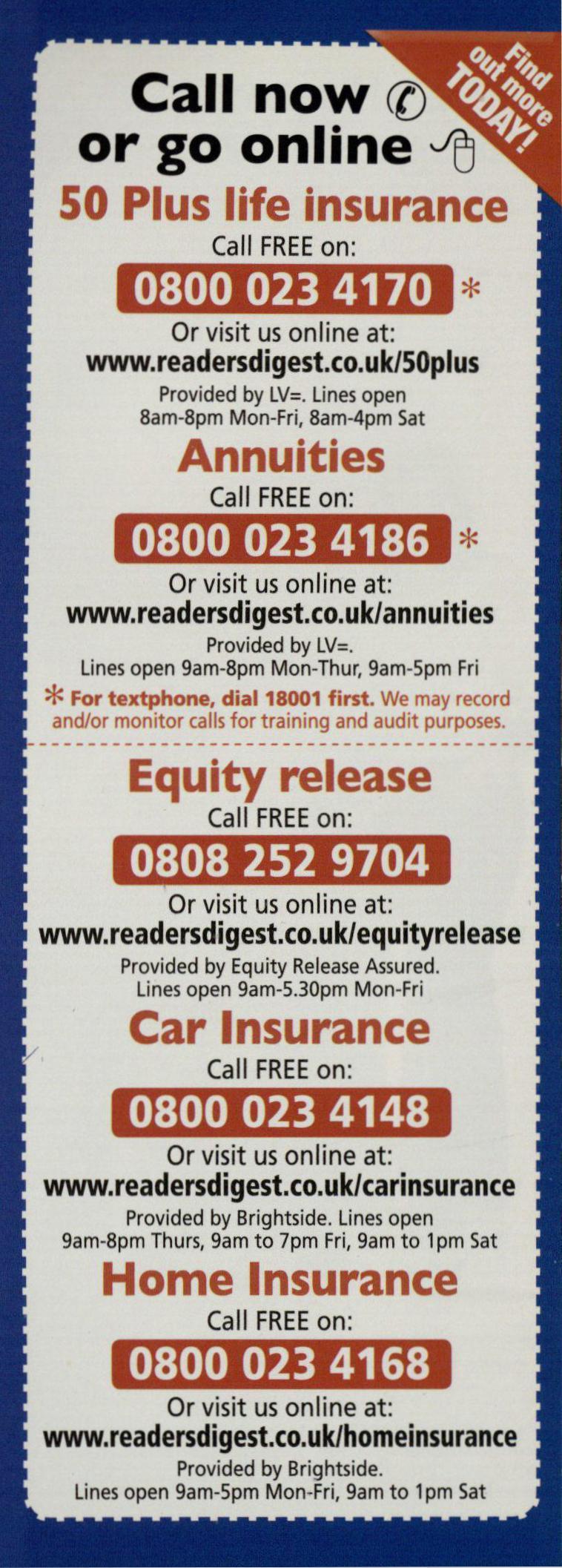 Call now © or go online -/-0 50 Plus life insurance Call FREE on: 0800 023 4170 * Or visit us online at: www.readersdigest.co.uk/50plus Provided by LV=. Lines open 8am-8pm Mon-Fri, 8am-4pm Sat Annuities Call FREE on: 0800 023 4186 Or visit us online at: www.readersdigest.co.uk/annuities Provided by LV=. Lines open 9am-8pm Mon-Thur, 9am-5pm Fri * For textphone, dial 18001 first. We may record and/or monitor calls for training and audit purposes. Equity release Call FREE on: 0808 252 9704 Or visit us online at: www.readersdigest.co.uk/equityrelease Provided by Equity Release Assured. Lines open 9am-5.30pm Mon-Fri Car Insurance Call FREE on: 0800 023 4148 Or visit us online at: www.readersdigest.co.uk/carinsurance Provided by Brightside. Lines open 9am-8pm Thurs, 9am to 7pm Fri, 9am to 1pm Sat Home Insurance Call FREE on: 0800 023 4168 Or visit us online at: www.readersdigest.co.uk/homeinsurance Provided by Brightside. Lines open 9am-5pm Mon-Fri, 9am to 1pm Sat
