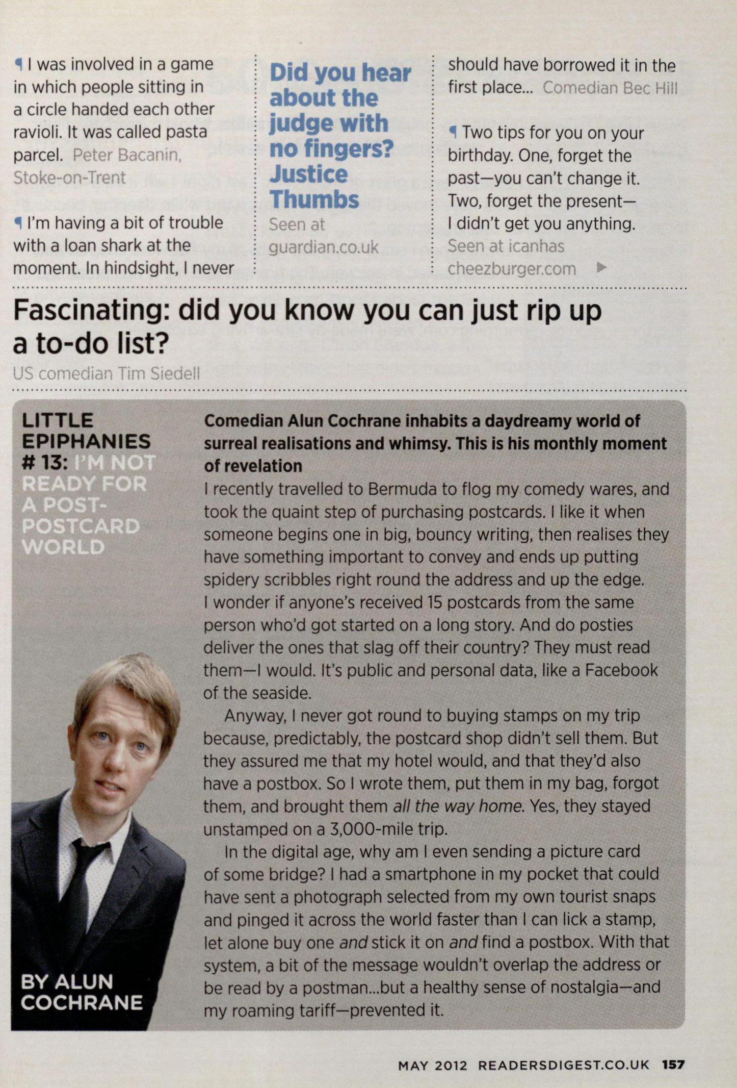 I recently travelled to Bermuda to flog my comedy wares, and took the quaint step of purchasing postcards. I like it when someone begins one in big, bouncy writing, then realises they have something important to convey and ends up putting spidery scribbles right round the address and up the edge. I wonder if anyone's received 15 postcards from the same person who'd got started on a long story. And do posties deliver the ones that slag off their country? They must read them—I would. It's public and personal data, like a Facebook of the seaside.