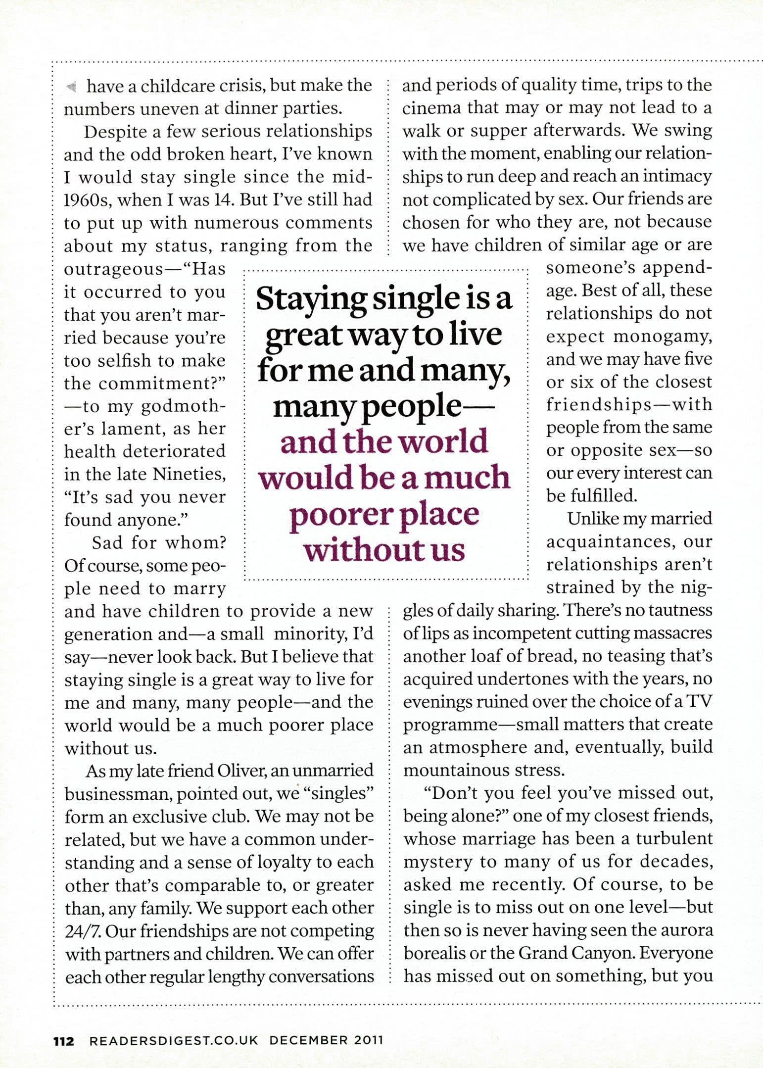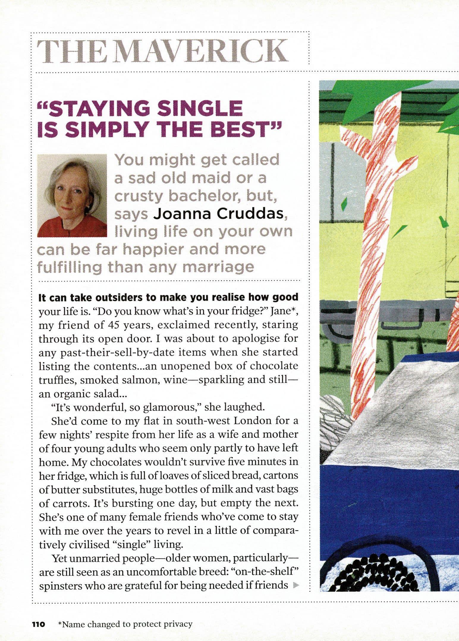 "The benchmark of success for too many people is still whether or not we've shed our single existence," says freelance writer Joanna Cruddas (p110).