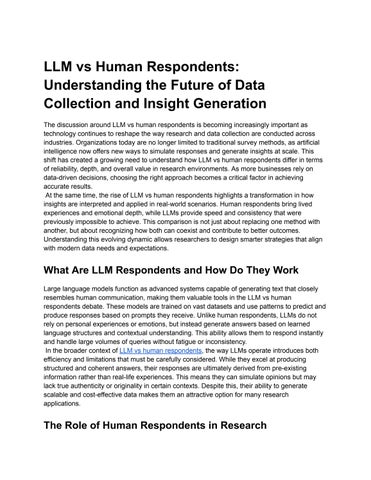 Large language models function as advanced systems capable of generating text that closely resembles human communication, making them valuable tools in the LLM vs human respondents debate. These models are trained on vast datasets and use patterns to predict and produce responses based on prompts they receive Unlike human respondents, LLMs do not rely on personal experiences or emotions, but instead generate answers based on learned language structures and contextual understanding. This ability allows them to respond instantly and handle large volumes of queries without fatigue or inconsistency