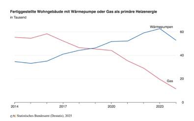In immer mehr neuen Wohngebäuden in Deutschland werden Wärmepumpen zum Heizen genutzt. Mehr als zwei Drittel der im Jahr 2024 fertiggestellten knapp 76.100 Wohngebäude nutzen Wärmepumpen als primäre Energiequelle, also überwiegend zum Heizen. Im Vergleich zu 2014 (31,8 Prozent) hat sich dieser Wert mehr als verdoppelt. Wärmepumpen kommen vor allem in Einund Zweifamilienhäusern zum Einsatz: In 74,1 Prozent aller im Jahr 2024 fertiggestellten Ein- und Zweifamilienhäuser wurde eine Wärmepumpe als primäre Heizenergie genutzt; in Mehrfamilienhäusern war dies deutlich seltener der Fall (45,9 Prozent).