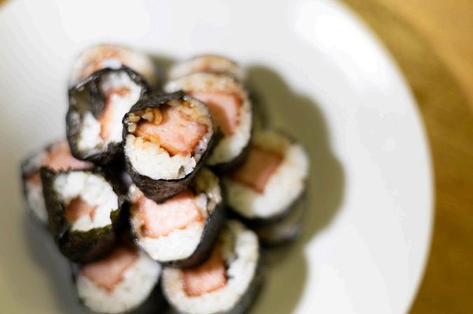 Place ½ can of roasted SPAM, one strip of danmuji (yellow pickled radish) or any pickles as an alternative, and some veggies of your choice (ideally cooked and mushy).