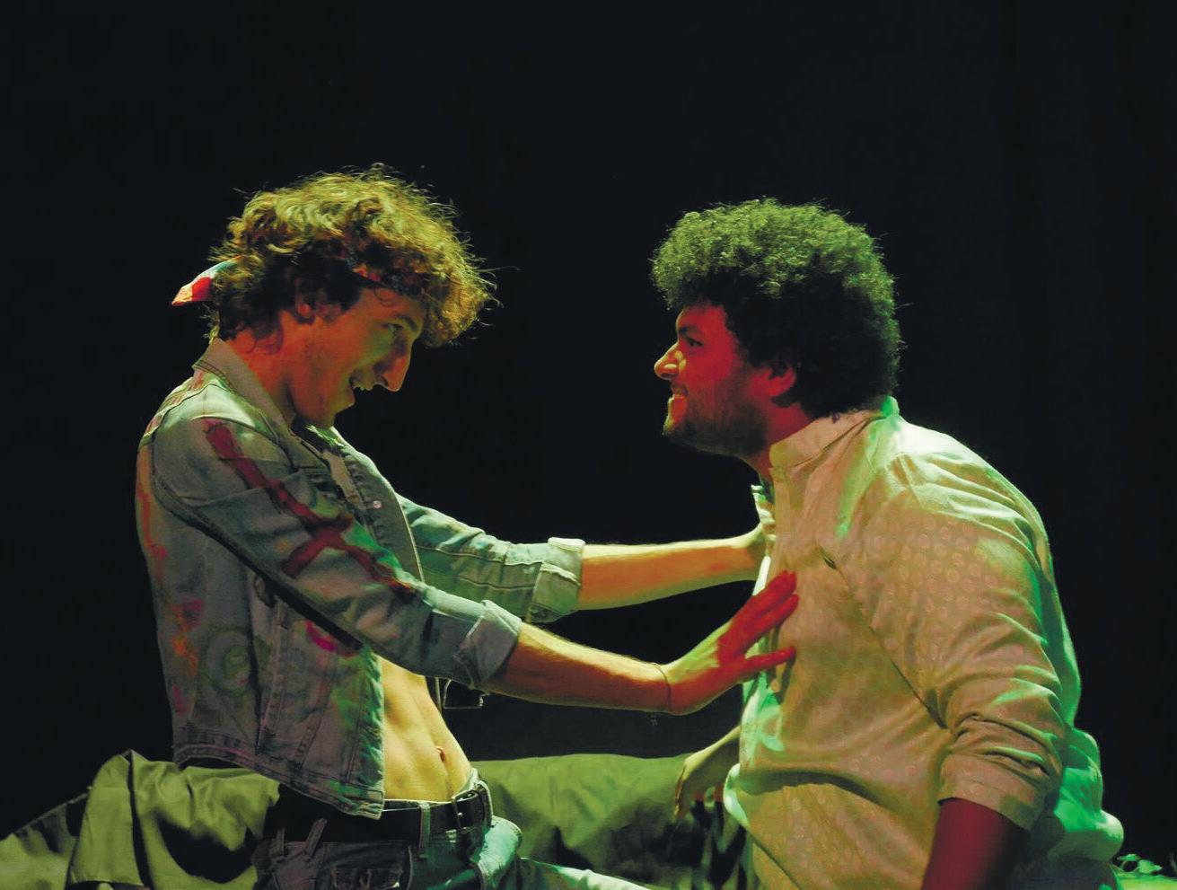 e directorial choices worked brilliantly with the text to cra new narratives, illuminate the characters, and bring to light the spirit of the play. Complete with denim-on-denim, drugs, and anti-war posters, the 60s ower-child staging was a delightfully appropriate choice for a play that is whimsical and earthy but underpinned by omnipresent military violence and conquests. e opening scene of the Athenian military hunting down Puck – conceived of by the directors – was tense, tightly choreographed, and totally not what I was expecting. e tone it established brought to light the discomfort that we (as a modern audience) have with Queen Hippolyta’s status as a war prize and the misogyny that underlies the Lovers’ interactions with the King and each other. Not only that, but it opened the extra-textual possibility of the humans’ awareness of, and interaction with, fairies—a concept that shi s the power dynamics between these two worlds. I loved the way these choices played out and made me think. My only gripe: this extra storyline was too compelling. I wanted more!