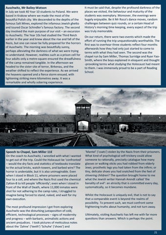 Speech to Chapel, Sam Miller 11E On the coach to Auschwitz, I wrestled with what I wanted to get out of the trip. Could the Holocaust be ‘confronted’ – would the dry facts and statistics of textbooks translate to the actual bricks, watch-towers, and barbed wire? The horror is undeniable, but it is also unimaginable. Even when I stood in Block 11, where prisoners were placed four to a cell, and where the Nazis first used the chemical Zyklon-B to kill people ‘efficiently’; even when I stood in front of the Wall of Death, where 11,000 inmates were shot for not adhering to the camp rules, I struggled to imagine being forced to stand, naked, and wait for my own execution.