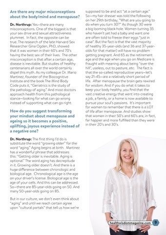 Are there any major misconceptions about the body/mind and menopause? Dr. Northrup: Yes—there are many misconceptions. One of the biggest is that your sex drive and sexual attractiveness plummet. In fact, the opposite can be true. The research of the late Harvard Sex Researcher Gina Ogden, PhD, showed that it was women in their 60’s and 70’s having the best sex of their lives. The other misconception is that after a certain age, disease is inevitable. But studies of healthy centenarians all over the world certainly dispel this myth. As my colleague Dr. Mario Martinez, founder of the Biocognitive Institute and the book The Mind Body Code puts it, “Geriatrics is the study of the pathology of aging.” And most doctors approach health from this pathological stance—looking for what can go wrong instead of supporting what can go right.