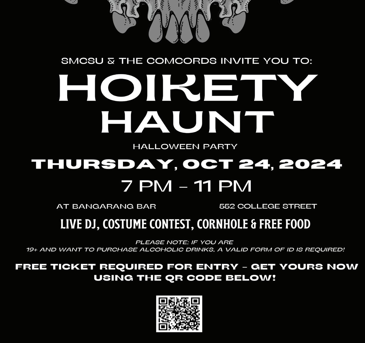 SMCSU is set to bring back the high-energy, party-style events that students have been missing with the highly anticipated Hoikety Haunt Halloween Party at Bangarang Bar. Kicking off at 7 pm on October 24, this Halloween bash will be complete with dancing, a costume contest, live DJ, and free catered food from Osmows’s Shawarma and Fresca Pizza.