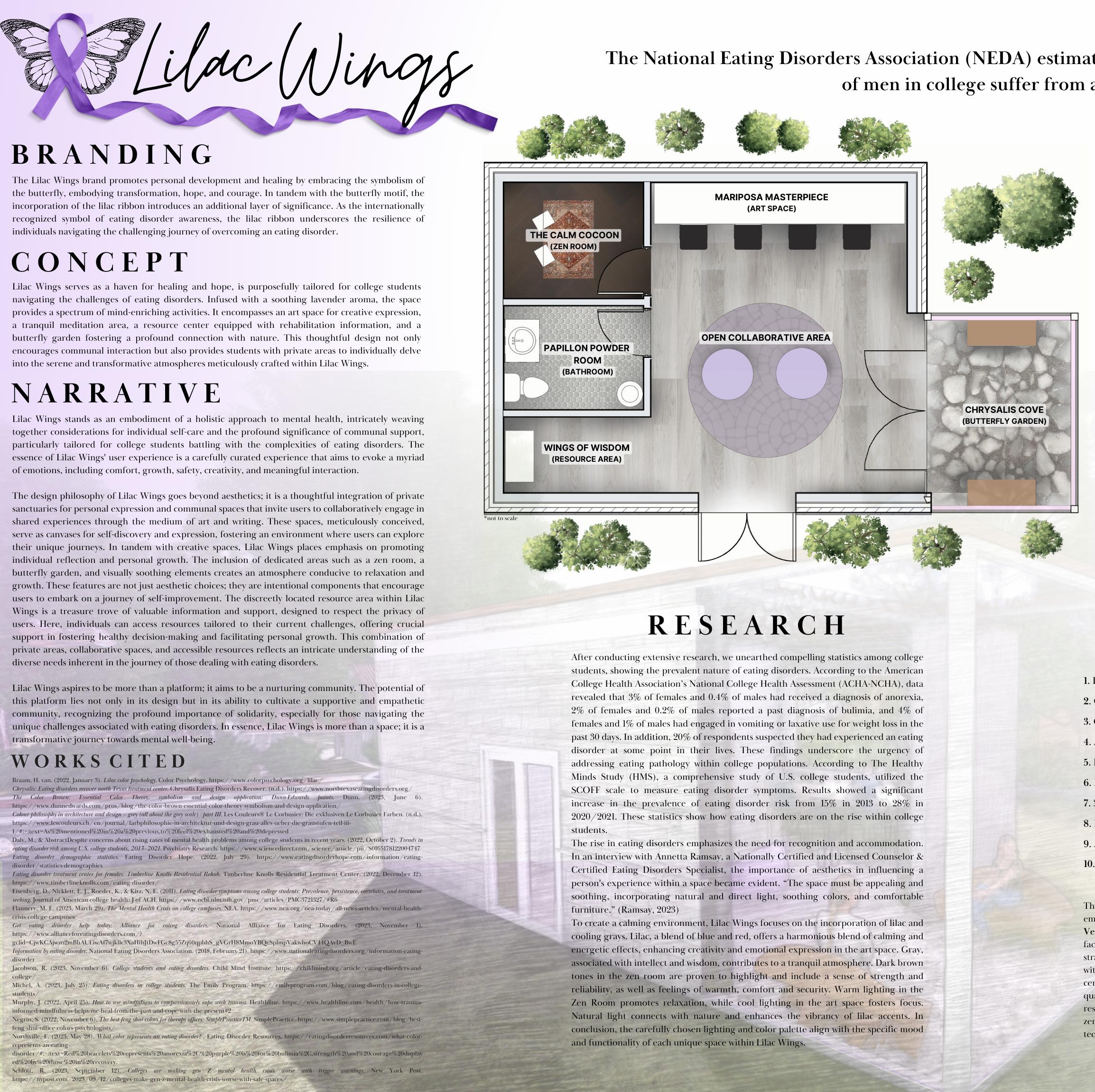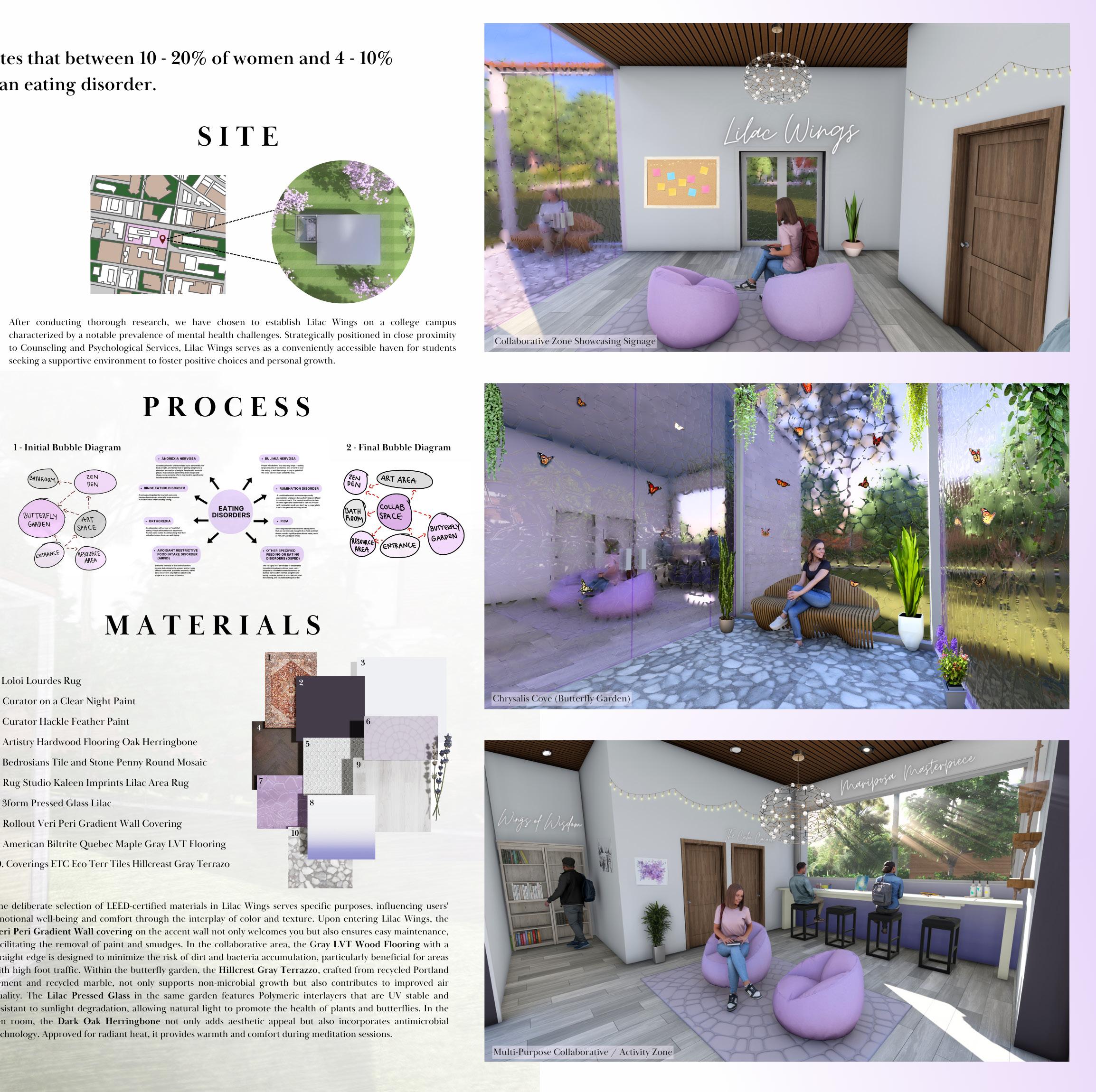 There is a critical need for safe, restorative physical spaces on college campuses – mind-scapes – that promote wellness and foster a sense of community. In response, this project aimed to create an interior environment which encourages healing. Investigating the potential of an interior environment to provide a healing influence, there was a careful consideration of interiors and the energy they provide and the experiences they offer, in addition to conventional restorative elements. This mindscape in particular is targeted towards college students struggling with various eating disorders.