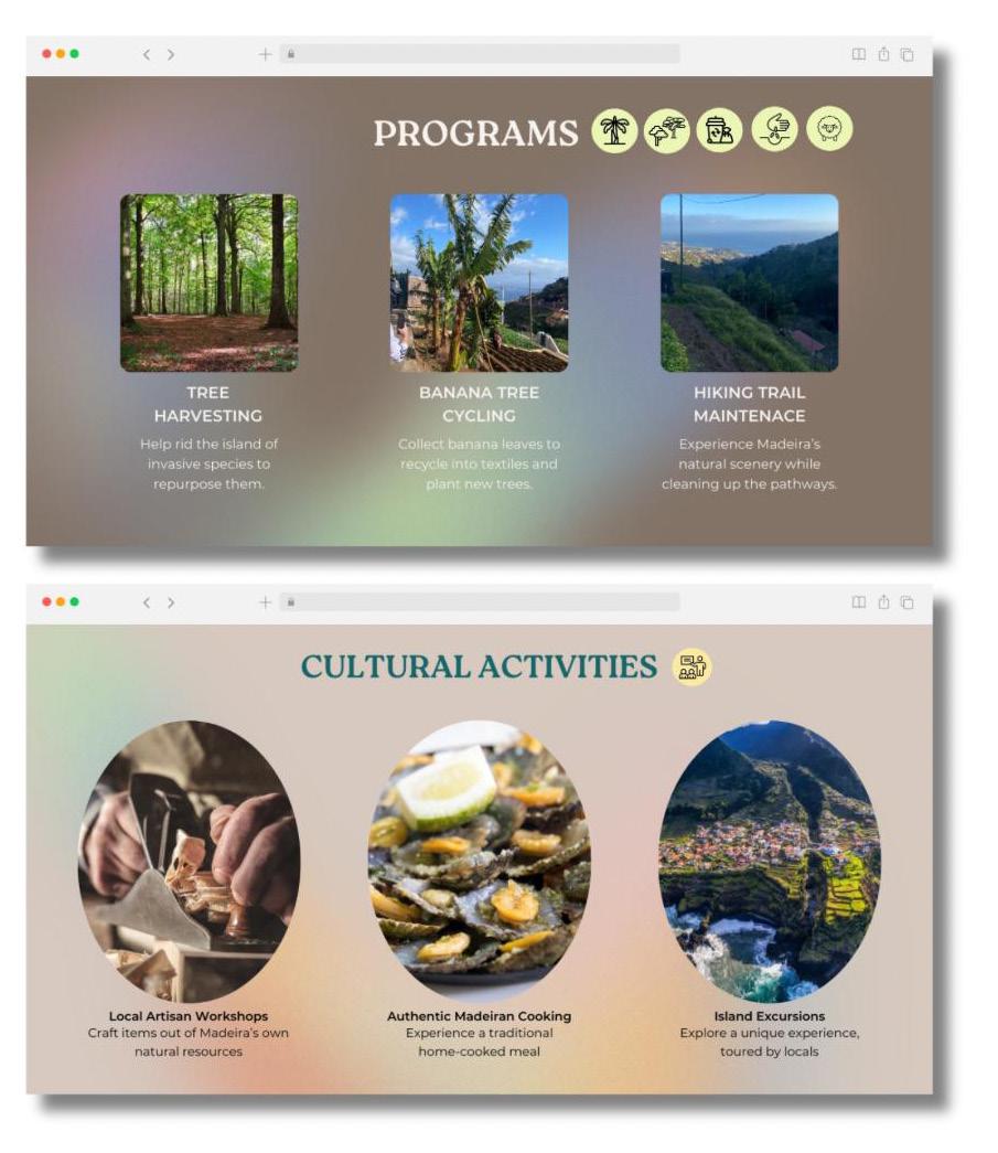 This group project was completed during an international design workshop, “GIDE”, in Madeira, Portugal. madERA, a play on words, was created to help re-imagine Madeira island by integrating both locals and tourists. We aimed to restore the natural beauty of the island while fostering connections between locals and visitors. The project addresses two pressing issues: the encroachment of invasive plants and the neglect of abandoned buildings along our scenic hiking trails. Together, we’re not just cleaning up the island; we’re building a community rooted in environmental stewardship and cultural appreciation.