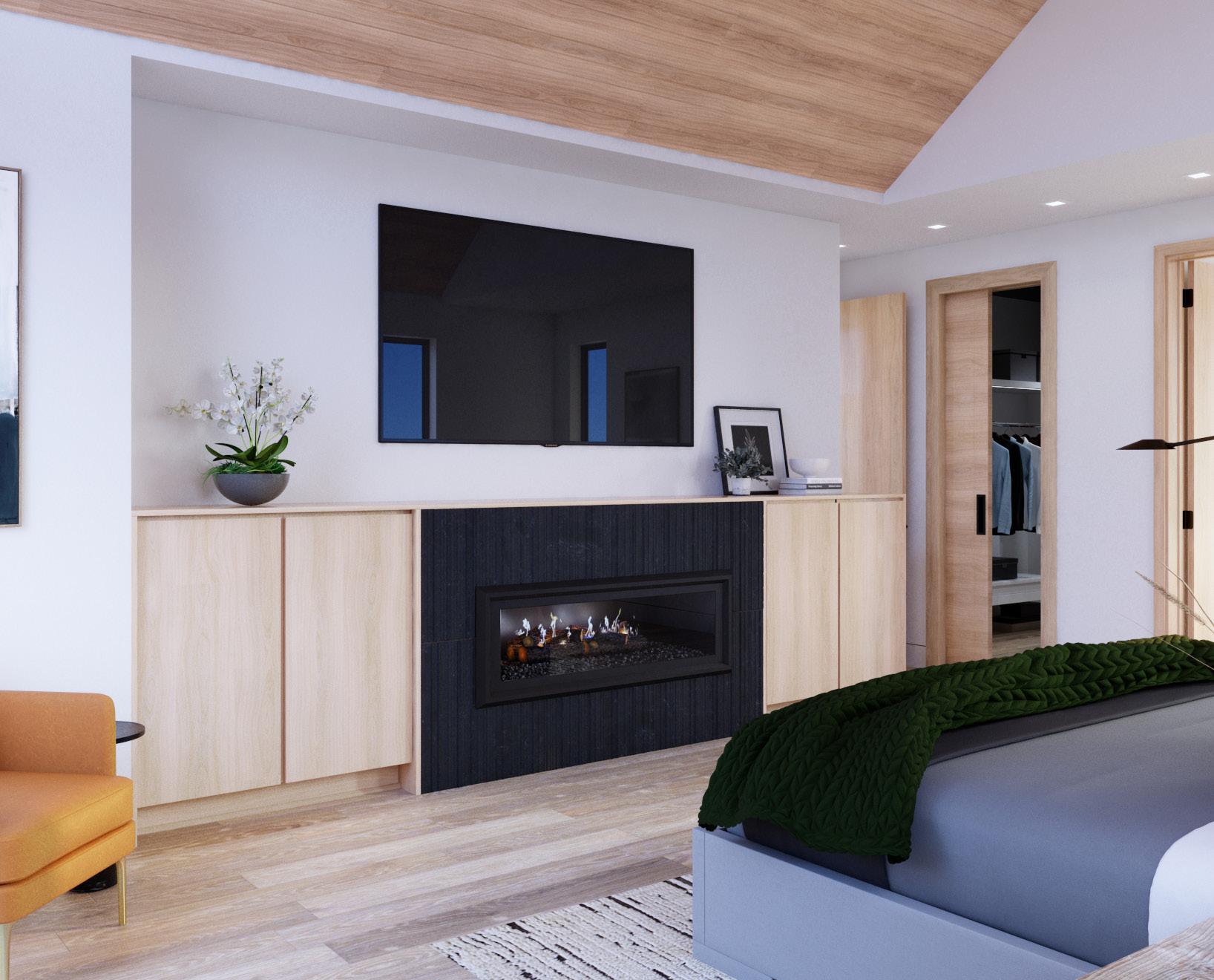 PRIMARY SUITE · Occupies Entire Upper Level for Ultimate Privacy · 16’ 2” Ceiling Height Oak Ceilings · Wide Plank White Oak Floors Net Zero Water Vapor Fireplace · Custom Millwork Automatic Blackout Shades · Views of Aspen Highlands and Tiehack Private Terrace · Dedicated Office Nook