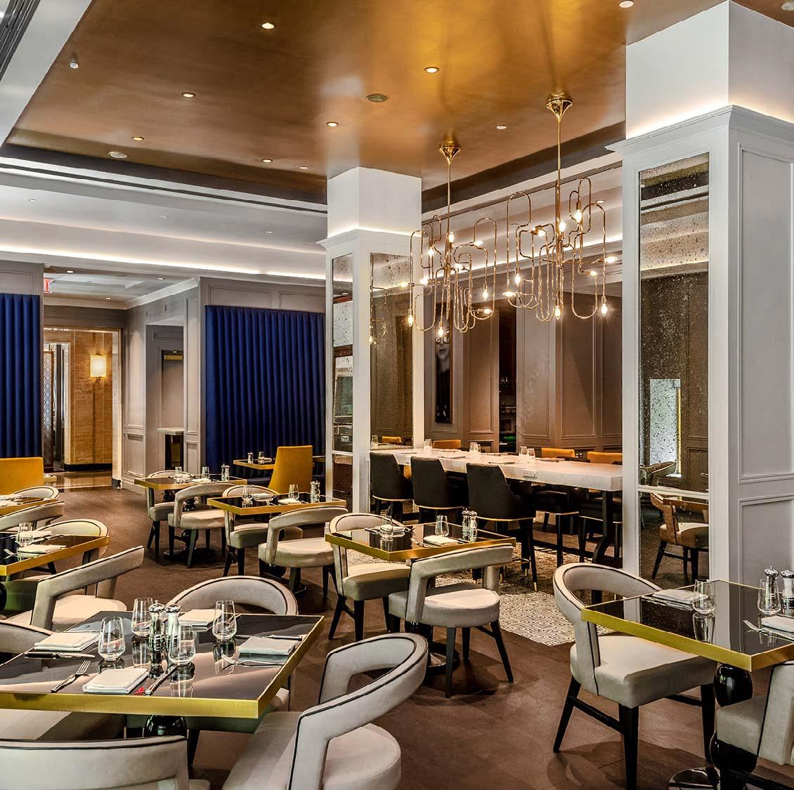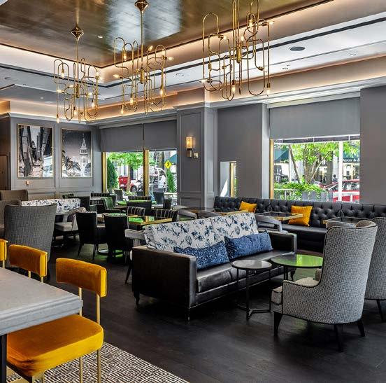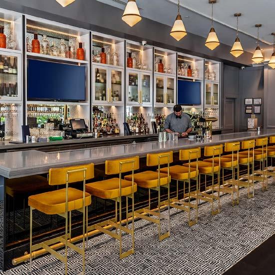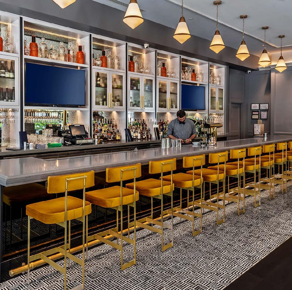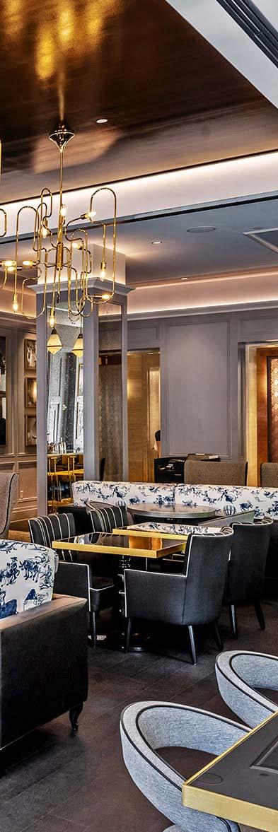 The two-part destination includes an 80-seat bar and 64-seat brasserie, with both spaces boasting a cohesive mix of curved brass lighting fixtures, black-andwhite tiled flooring, retro prints, and blue and gold furnishings throughout.