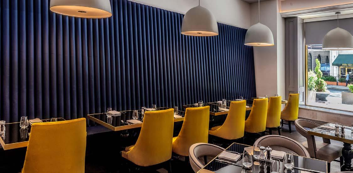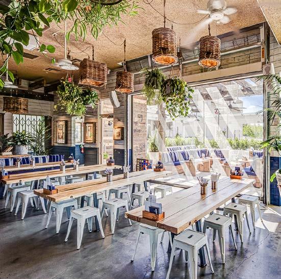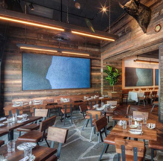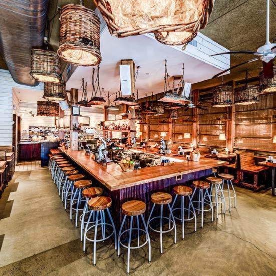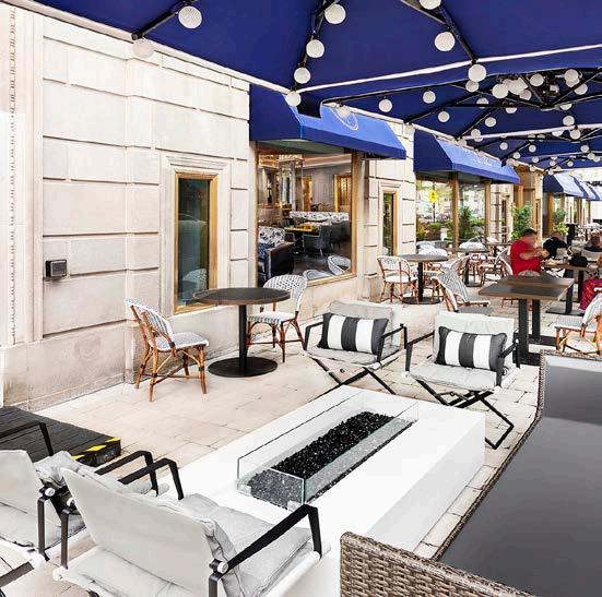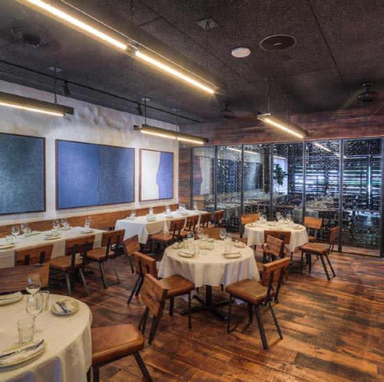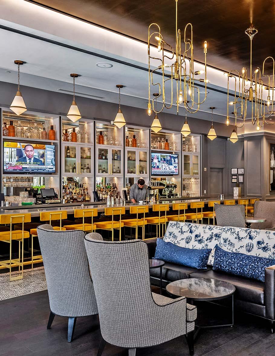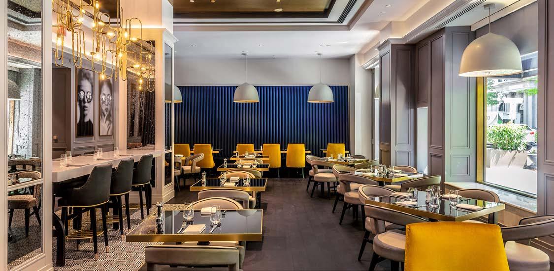 The two-part destination includes an 80-seat bar and 64-seat brasserie, with both spaces boasting a cohesive mix of curved brass lighting fixtures, black-andwhite tiled flooring, retro prints, and blue and gold furnishings throughout.
