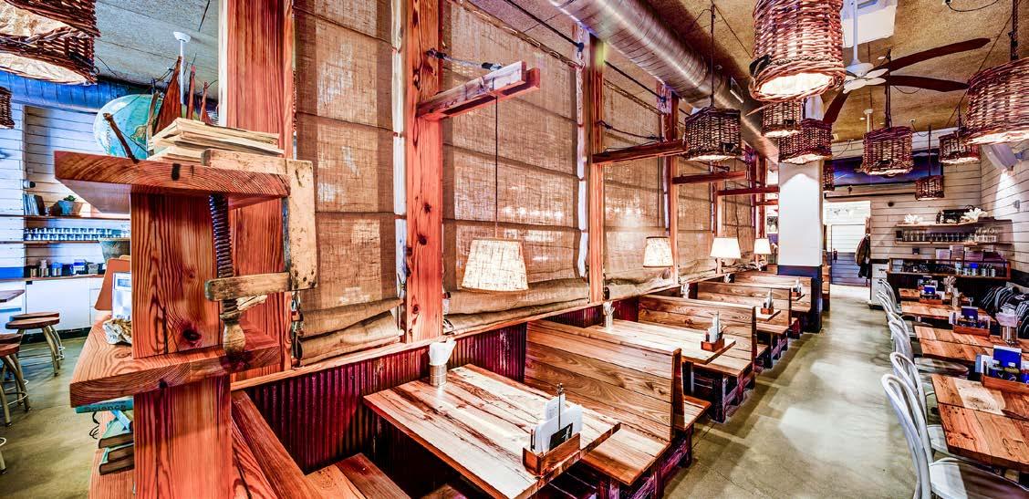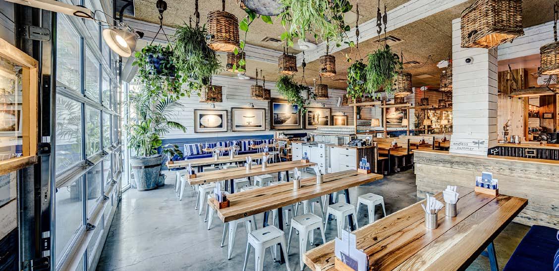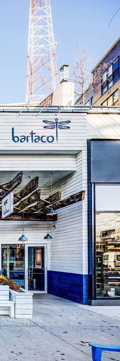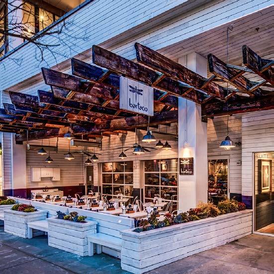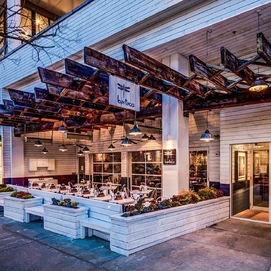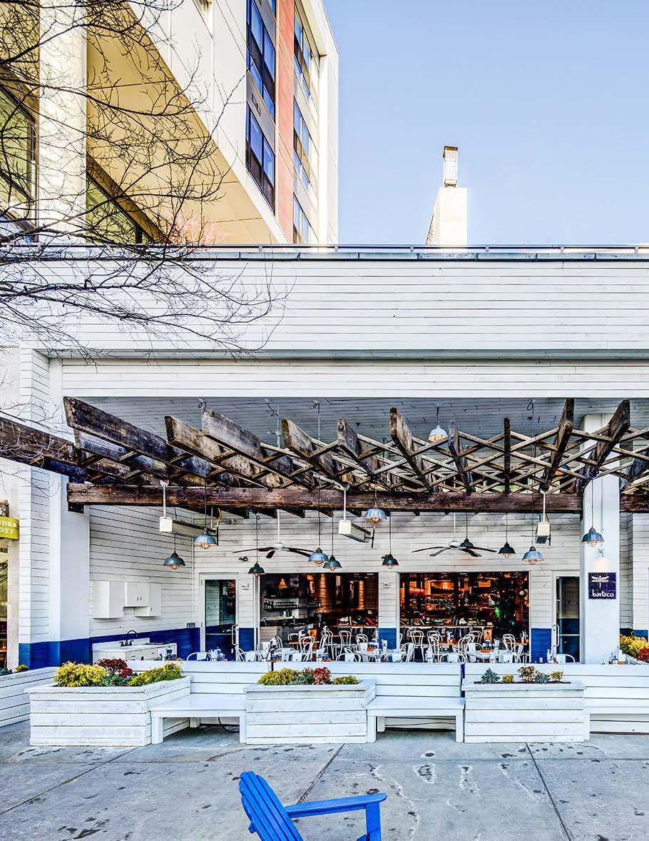 For multiple locations of the casual Bartaco, a whitewashed interior and hanging baskets contrast with polished concrete floors and travel-inspired artwork. For both the Mosaic and Reston locations in Northern Virginia and the King of Prussia location outside of Philadelphia, generous outdoor spaces and large bars create a festive atmosphere.