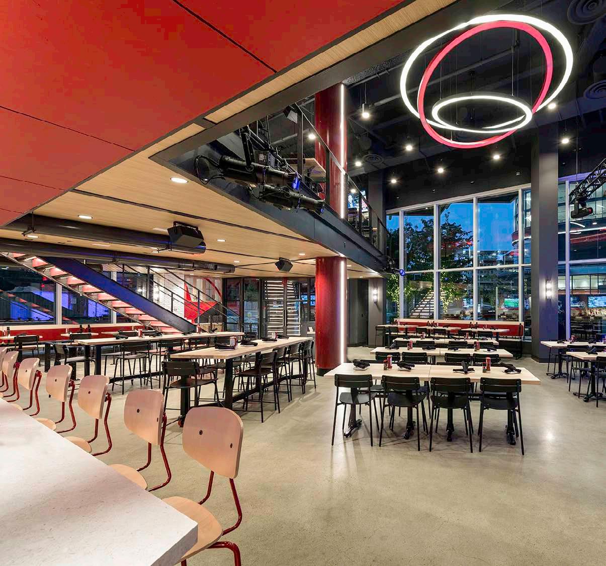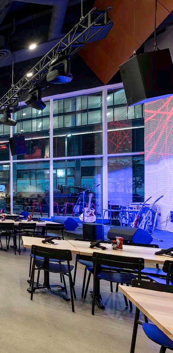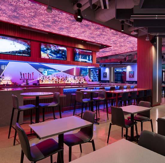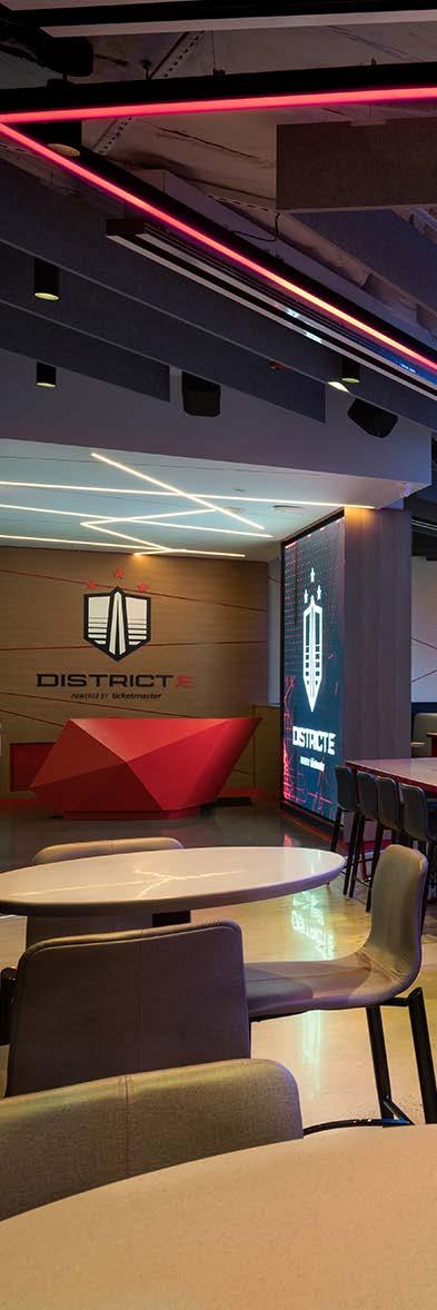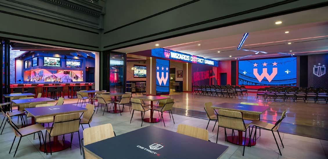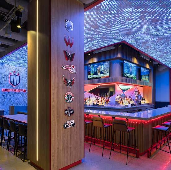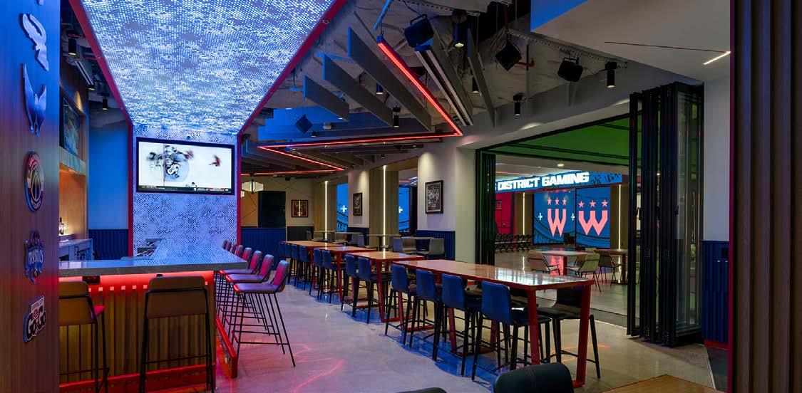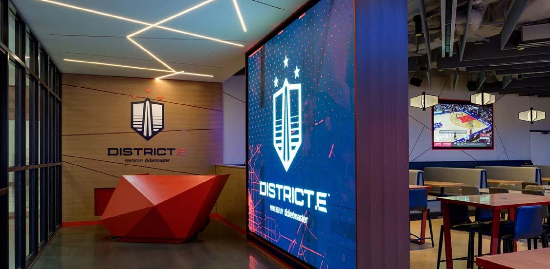 Centrally located in Washington, DC immediately adjacent to Capital One Arena, District E hosts its own shows, viewing parties, corporate events, and other programs as well as pre- and post-game events. Stateof-the-art LED walls, tickers, and video boards coupled with dynamic lighting, color, and materials create a sleek, modern, fully immersive digital experience.