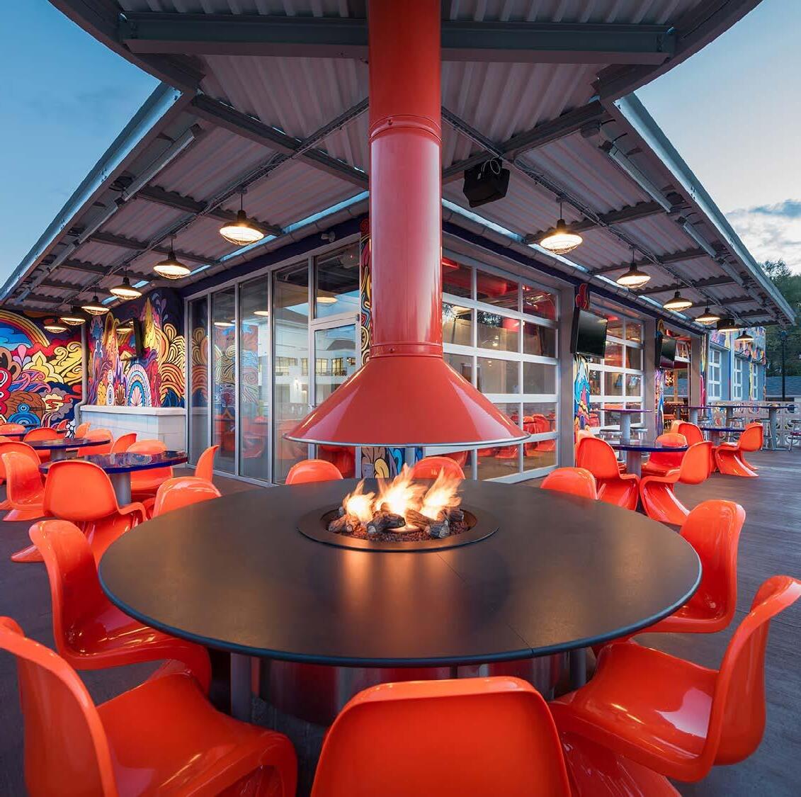 Aesthetics can include fire and water elements that would be impractical inside, including fire pits and exotic landscaping. Sun shading including awning, trellises, and umbrellas can help to control temperature and can also serve to create a sense of place. Ultimately, the outdoor experience must be an extension of the interior, supporting the brand experience.