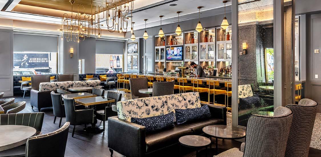 Interior architecture for the renovation of a hotel lobby bar, restaurant, and outdoor patio located in Washington, DC totaling 3,575 sf including selective demolition and construction, new finishes, and new equipment.