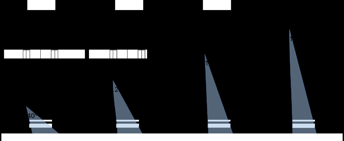 Figur I.7. Vandret udsynsvinkel for personer med forskellig afstand fra vinduet. En person ved første skrivebord fra vinduet har medium kvalitet af vandret udsyn, personerne ved andet og tredje skrivebord har minimum kvalitet af vandret udsyn og udsynet fra fjerde skrive er dårligere end minimum.