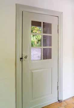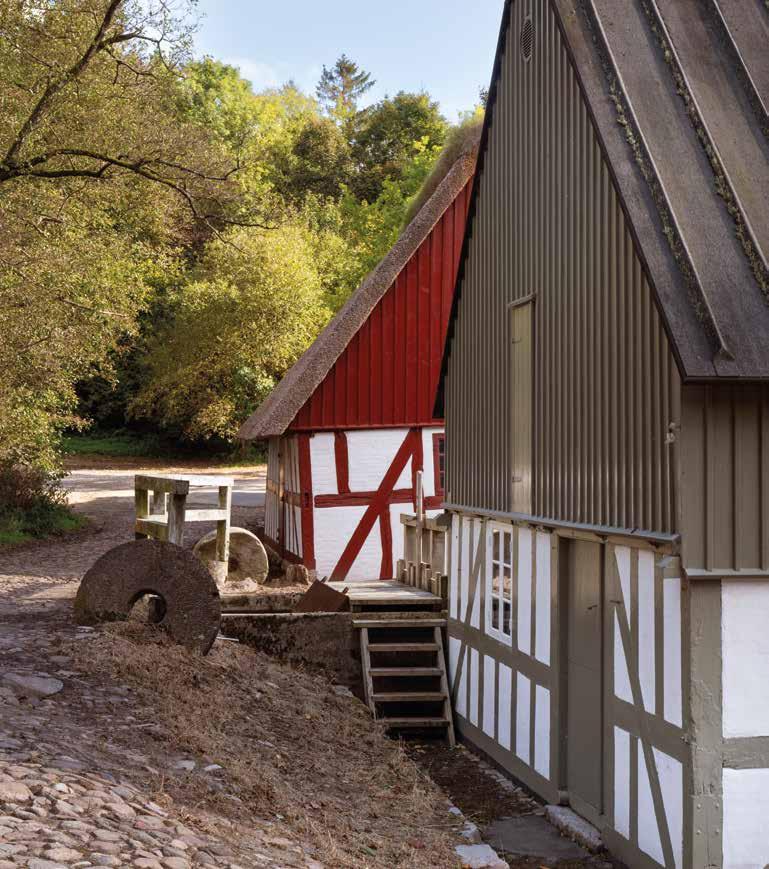 entire mill yard occupied an important position in Danish rural society at the time, and the division between the miller’s house and functional buildings can be clearly seen in the various building parts and details. The richer half-timbering of the miller’s house, its tight-fitting and larger windows, refined doors and the chimney pipes in the roof ridge clearly differ from the simpler timberwork and board cladding of the mill and farm buildings, as well as the ribbed doors and hatches.