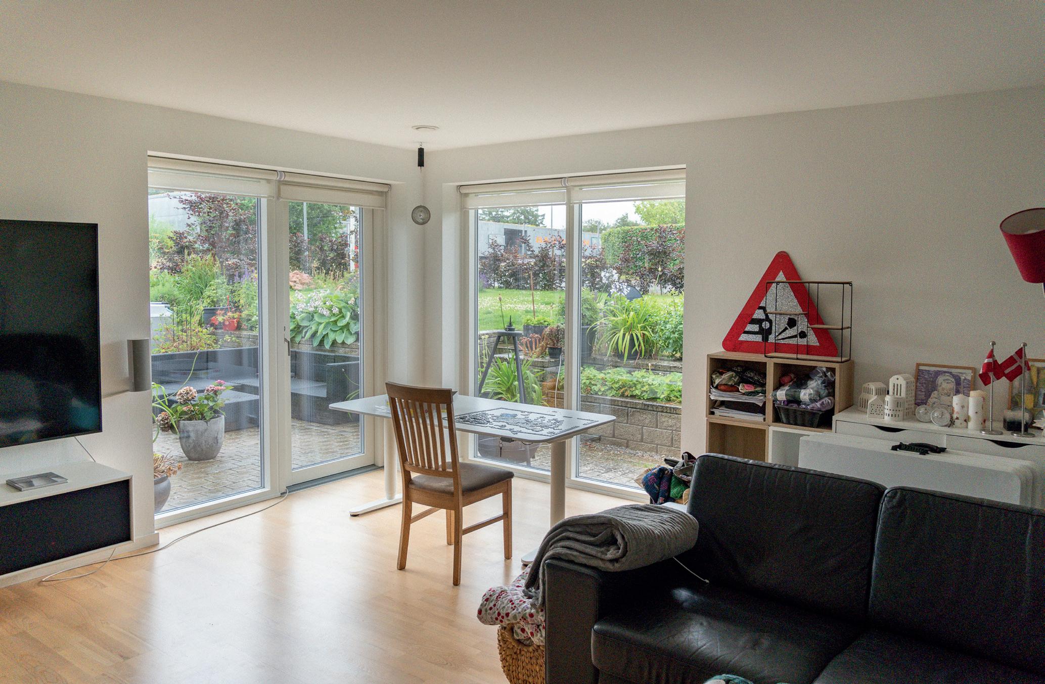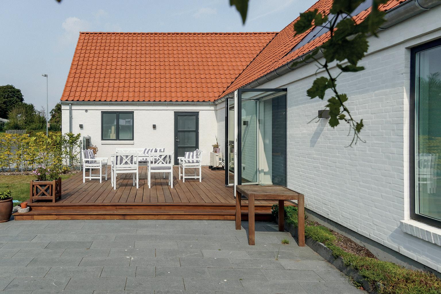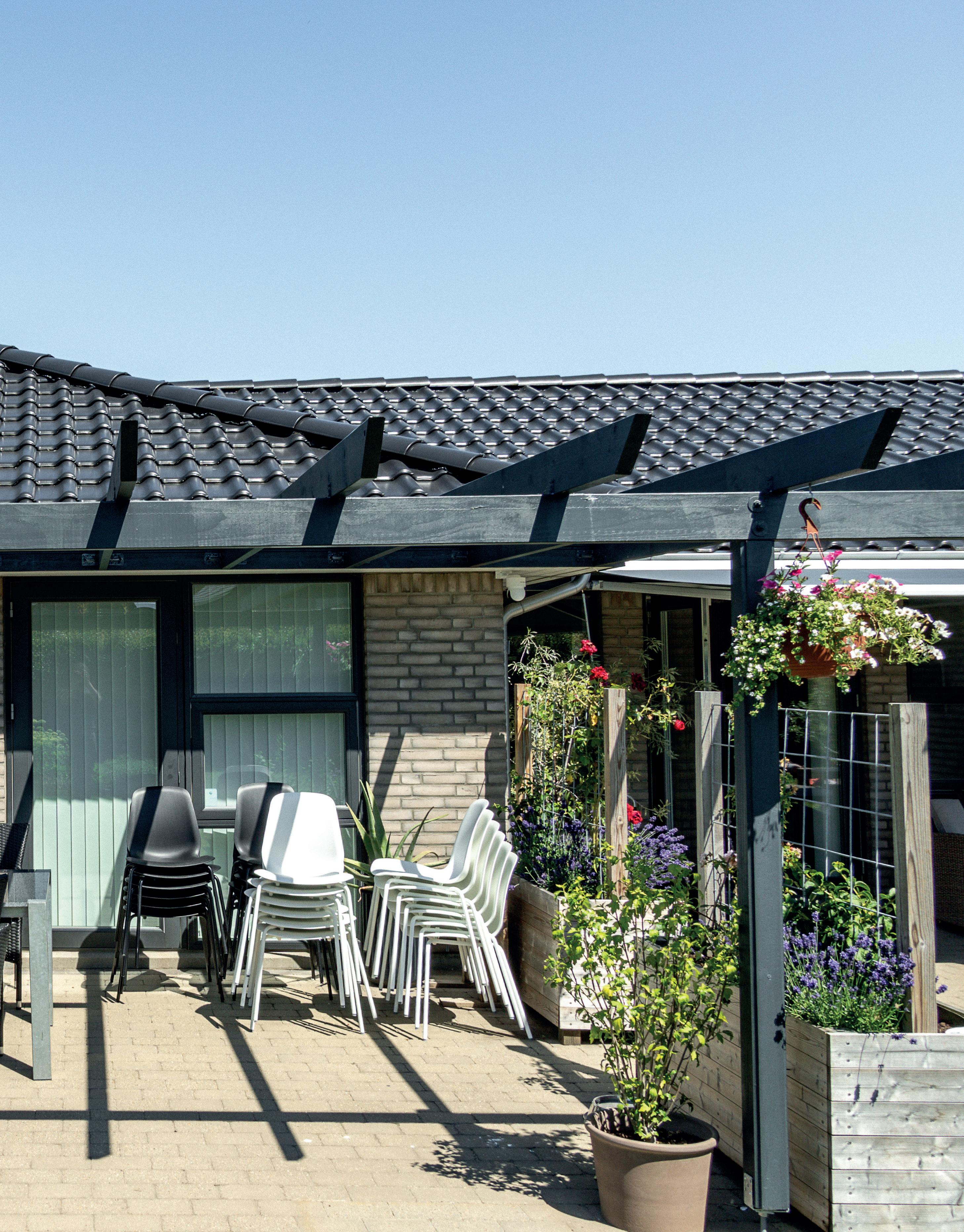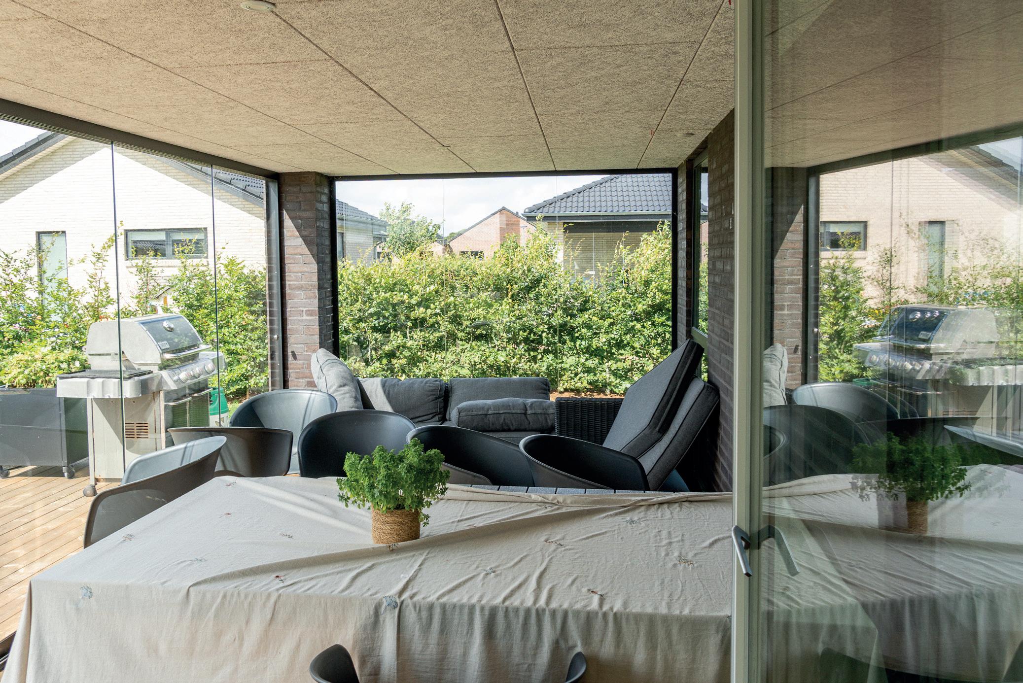 ”Vi blev lidt misundelige på naboernes udestue løsning med glas, så vi lavede det også. Nu kan vi sidde i den overdækkede terrasse næsten hele året – fra april til oktober. Det føles som et ekstra rum, hvor man stadig sidder behageligt, selv når det blæser.”