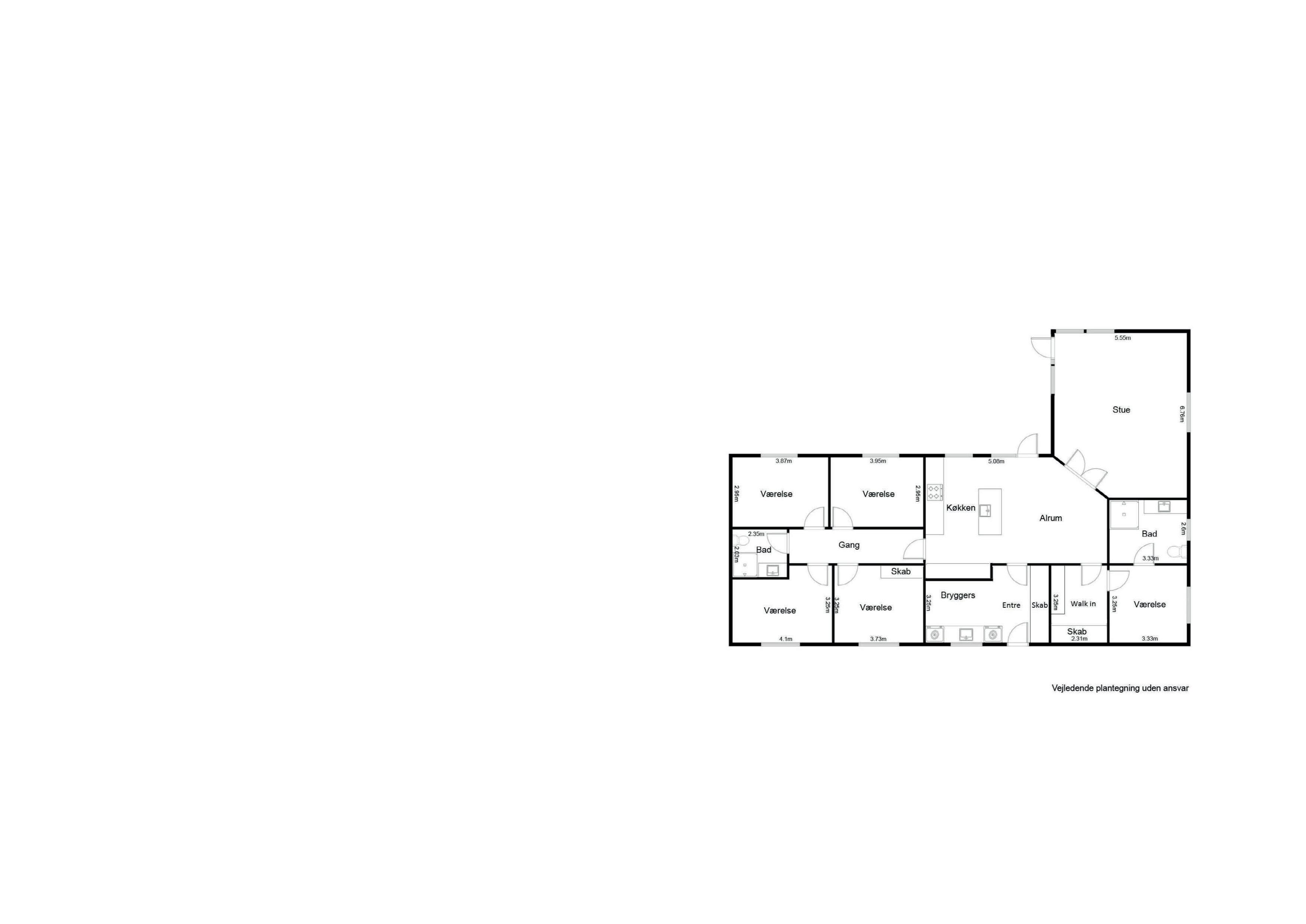 Funktionsrum: 2 badeværelser, køkken, bryggers, walk-in garderobe, skur
