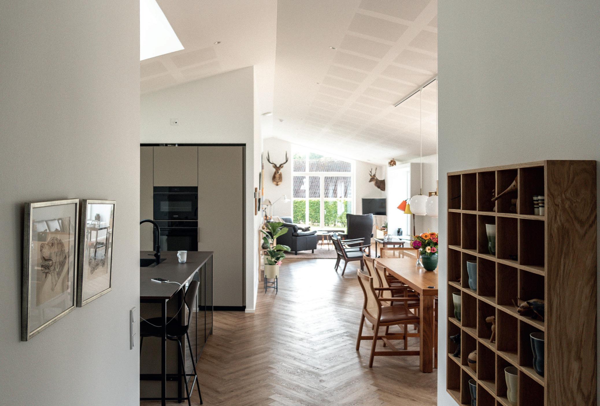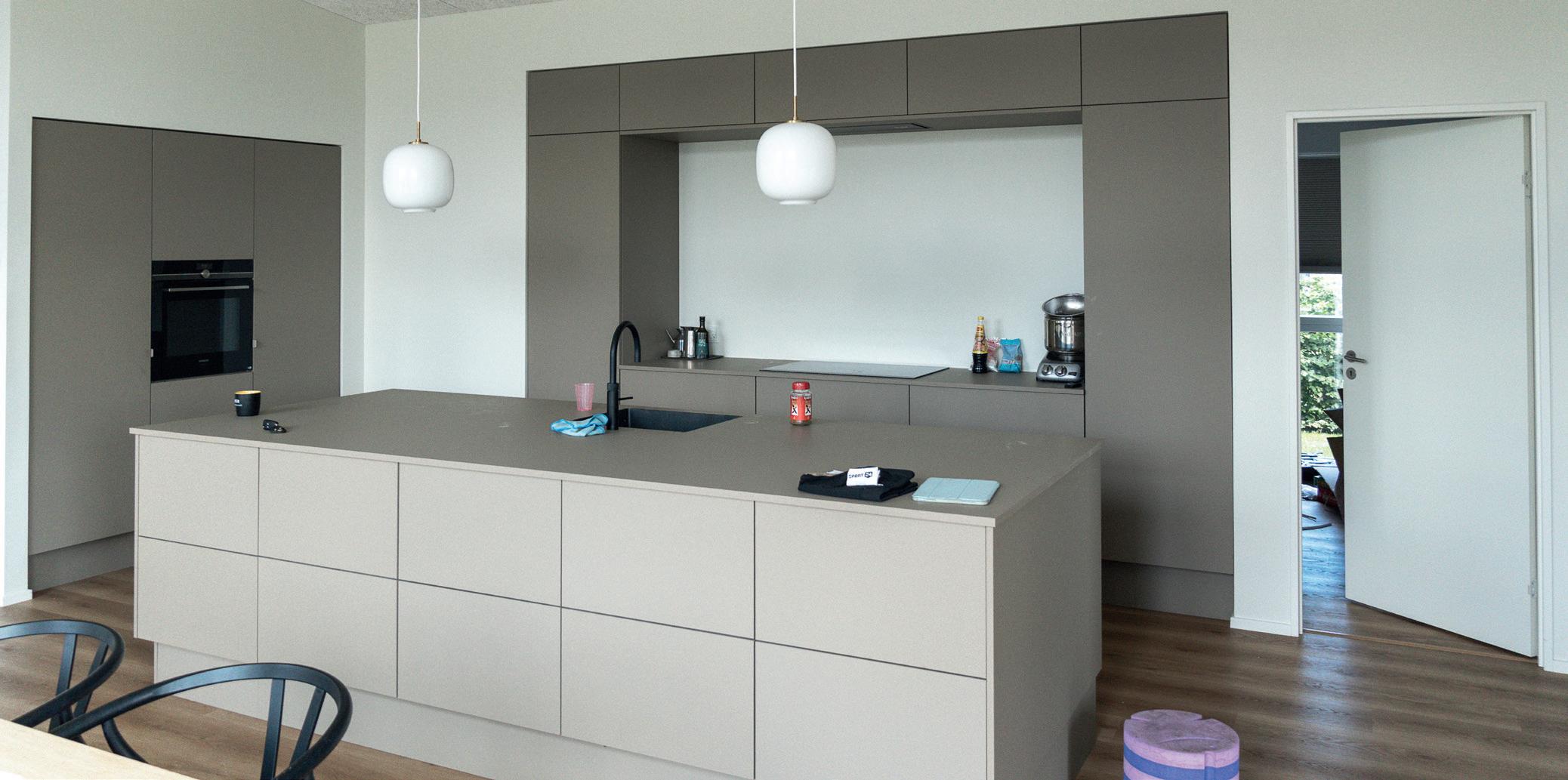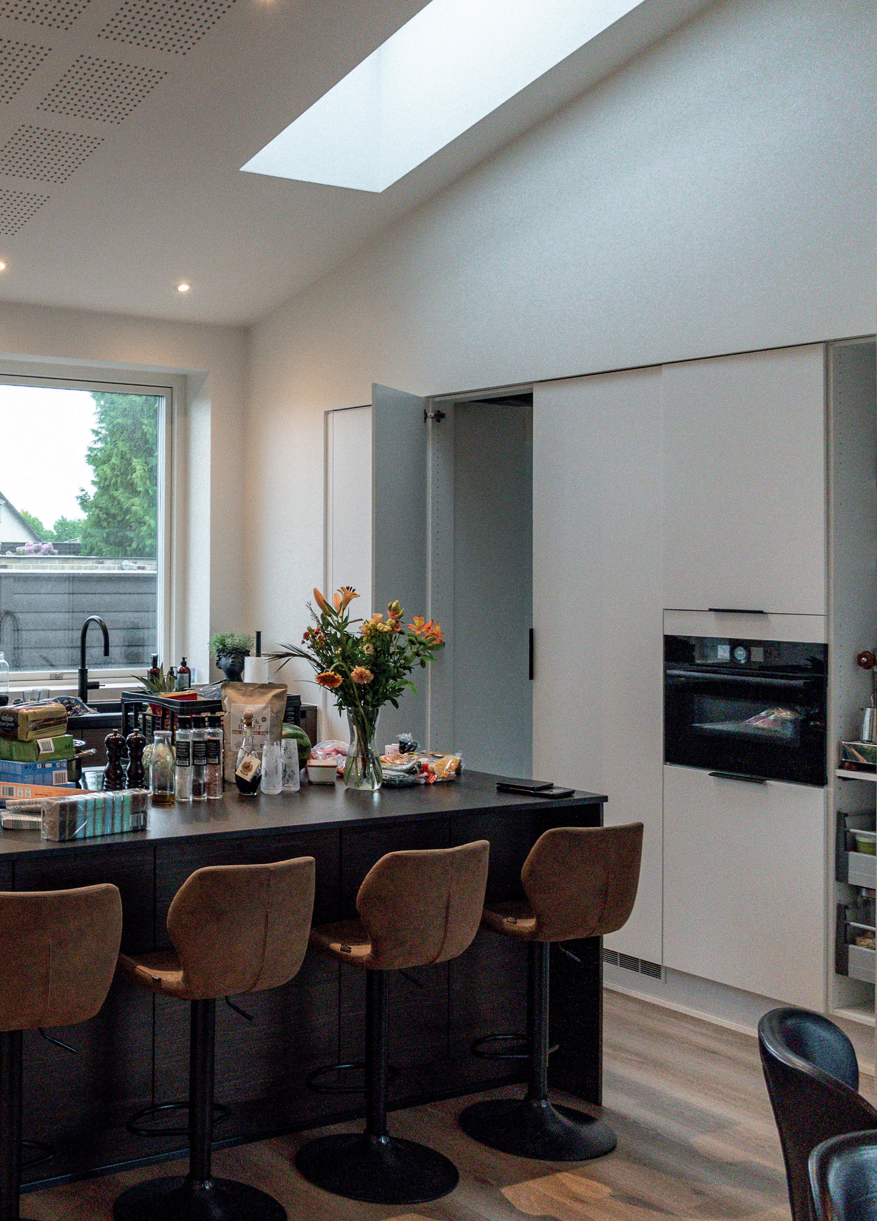 ”Noget af det, vi fandt ud af, giver kvalitet i hverdagen ved at bygge nyt, var blandt andet den øgede lofthøjde – det giver en helt fantastisk rumfornemmelse. Vi prioriterede også godt lys, ovenlysvinduer og et generøst lysindfald. Derudover syntes vi, at en alkove kunne noget særligt – det ville være sjovt at få med. Jeg ønskede mig et indbygget vinkøleskab, og det skulle der selvfølgelig være plads til. Og så ville vi gerne have et depot, som var lidt større end gennemsnittet.”