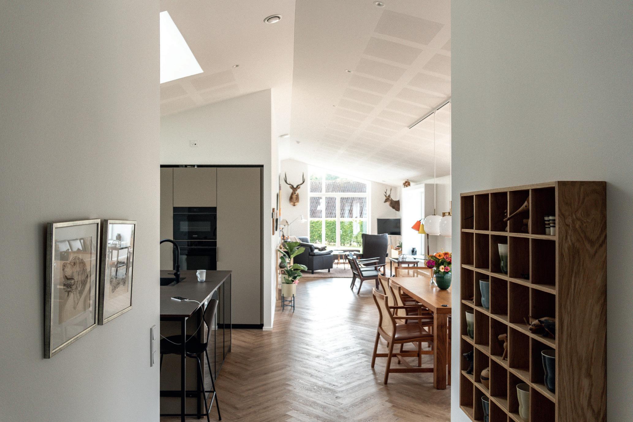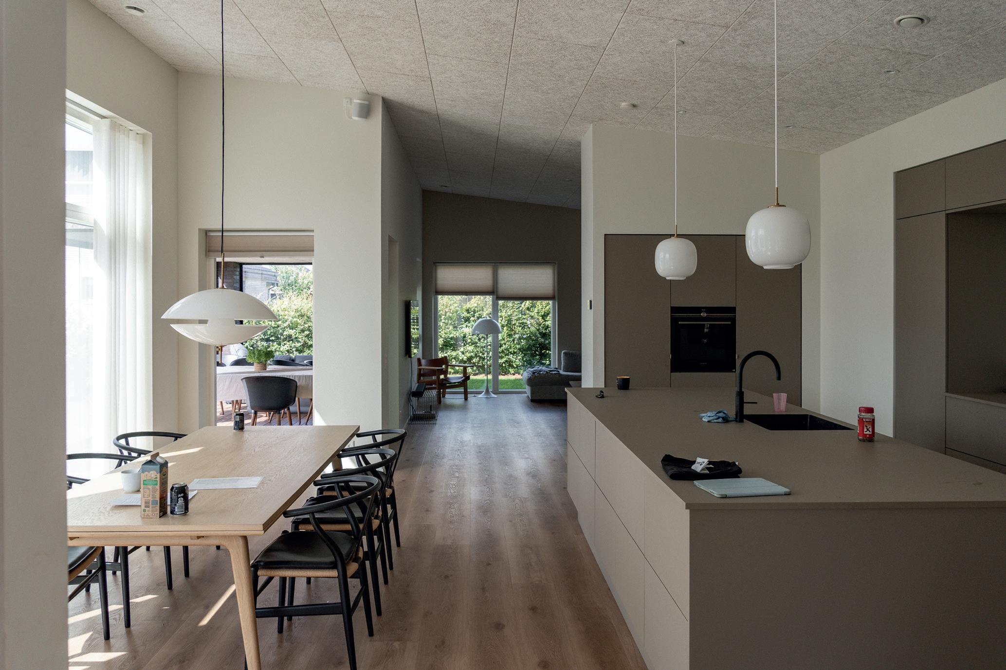 ”Vi synes, det er en stor kvalitet, at køkken-alrummet og stuen hænger sammen som ét stort rum. Man kan stå og lave mad, mens andre sidder i sofaen, og stadig være en del af fællesskabet. Det er her, vi opholder os mest – også når jeg arbejder hjemme, og min kone sidder og ser tv ved siden af.”