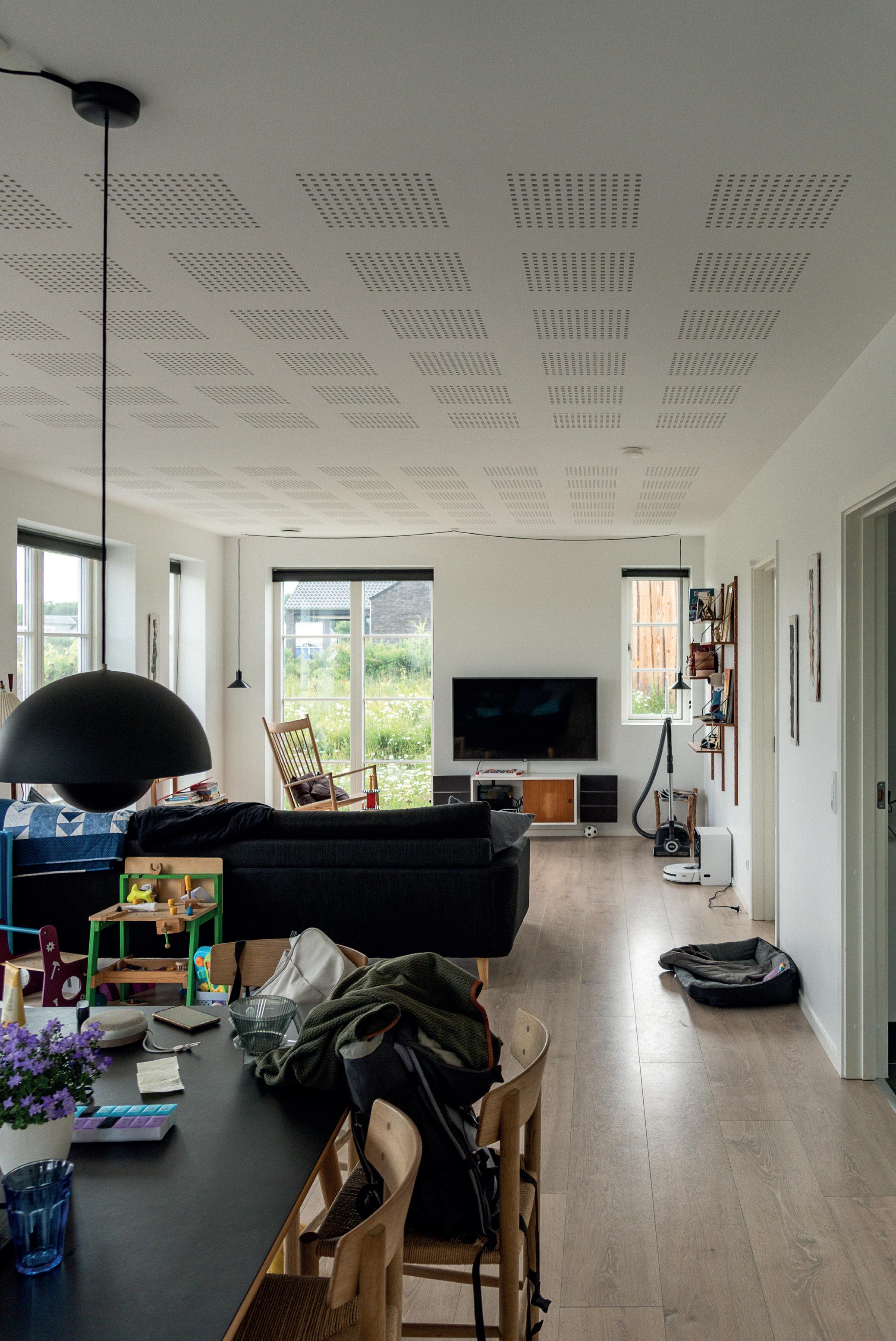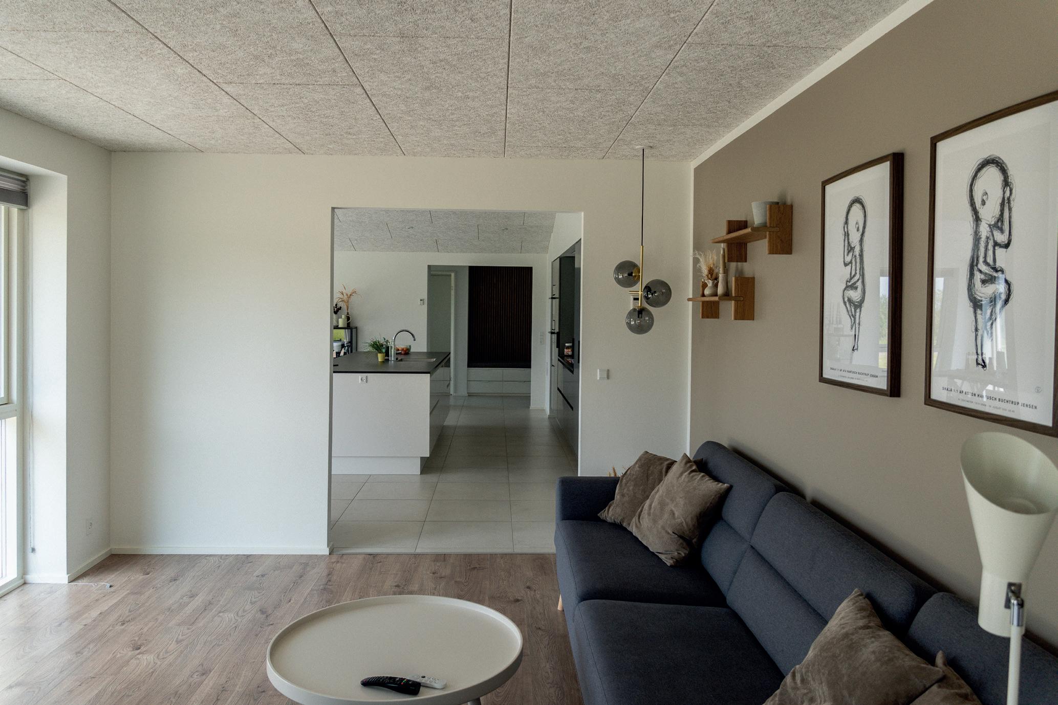 Gang, køkken-alrum og stue ligger i åben forbindelse med hinanden, hvilket kan skabe lydgener.