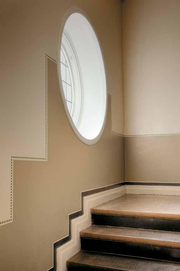 ge, hvad der svarede til et stykke A4 papir om dagen. Væggenes tykke lag spartel fik således lov til at blive, og rekonstruktion af de oprindelige farveskemaer blev i stedet valgt som strategi i de rum og rumforløb, hvor det gav mening.