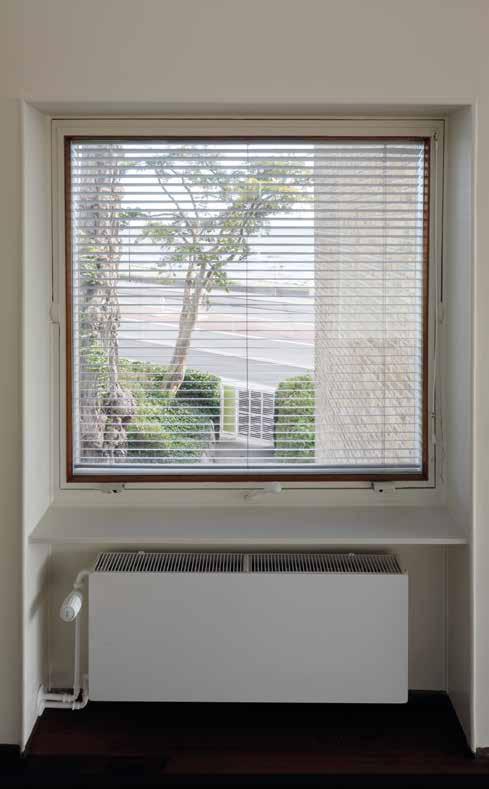 I huset på Strandvejen formidler begge stuer på trods af deres beskedne areal således en overraskende følelse af god plads, og begge nyder godt af skrå lofter, der kulminerer umiddelbart over balkonkanten i et højtliggende vinduesbånd.