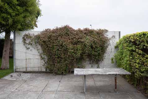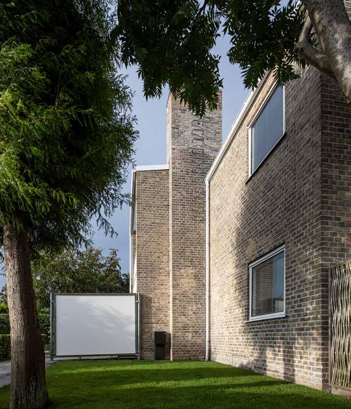 Og igen er kompositionen ikke kun æstetisk begrundet: Den forskudte tagform giver plads til et højtliggende vinduesbånd, der trækker et blidt nordlys ind i huset, mens taget hælder ned som kasketskygge mod havesidens mere skarpe sydlys. Ved hvert af husene skaber forskydningerne desuden inde i haven et intimt lille uderum og ud mod vejen en lille forplads, der i en vinkel afskærmer ankomsten til indgangsdøren i østgavlen og til en garage i kælderetagen.
