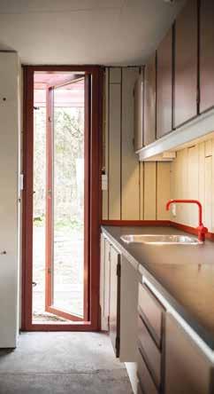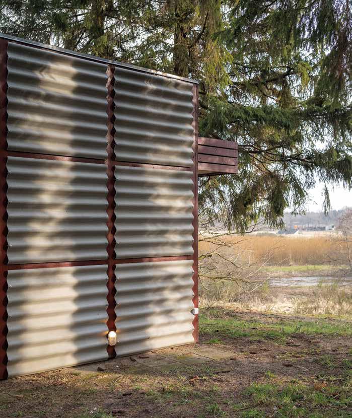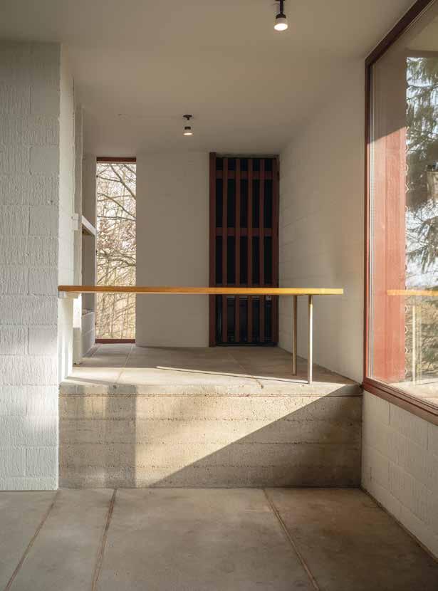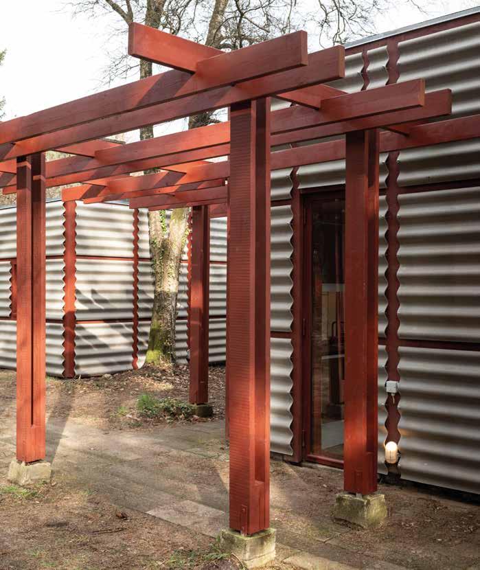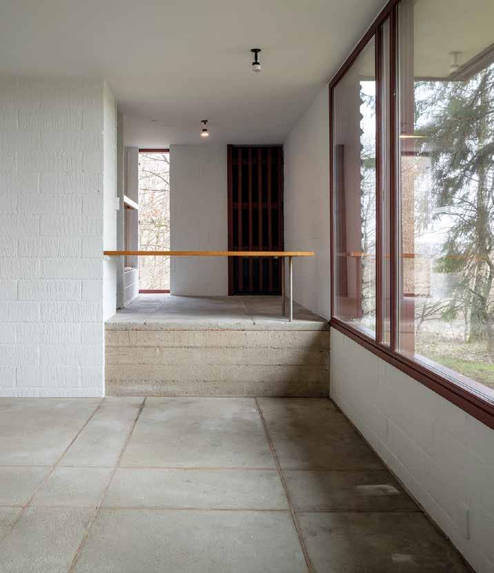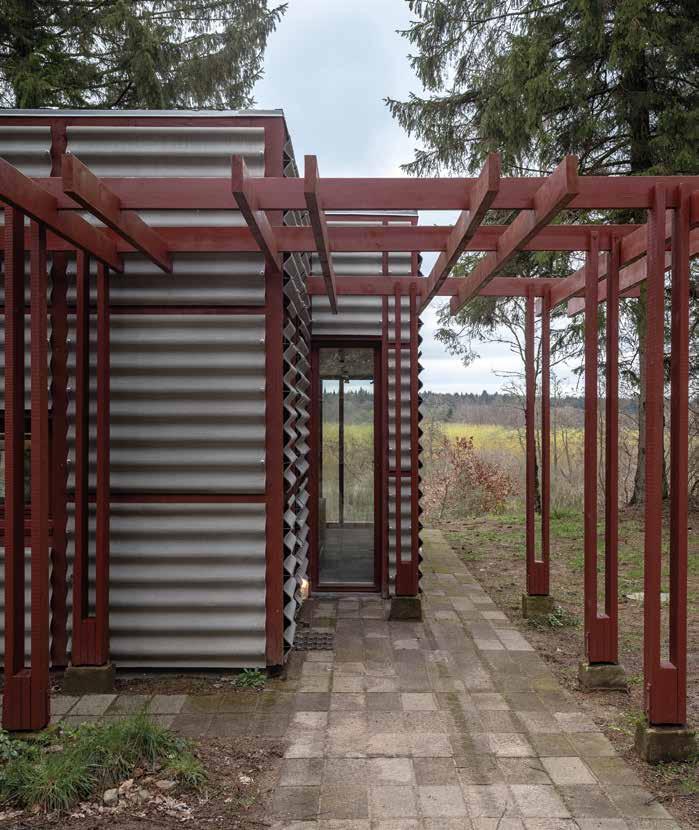 foran huset. Den lave tilbygning forstærker dermed den umærkeligt iscenesatte ankomst til huset, hvor man efter flere knæk i den smalle vej befinder sig i en lysning med huset som midtpunkt.