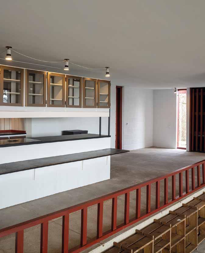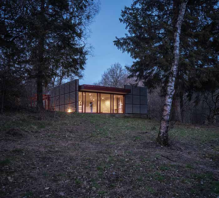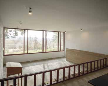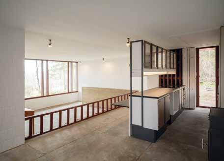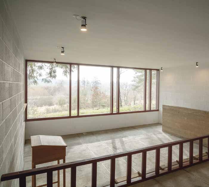 skiftende kig til skovens vertikale træstammer, der opstår gennem de øvrige åbninger, mens man bevæger sig rundt i huset. Desuden skaber åbningerne fra gulv til loft klart definerede murflader i interiøret.