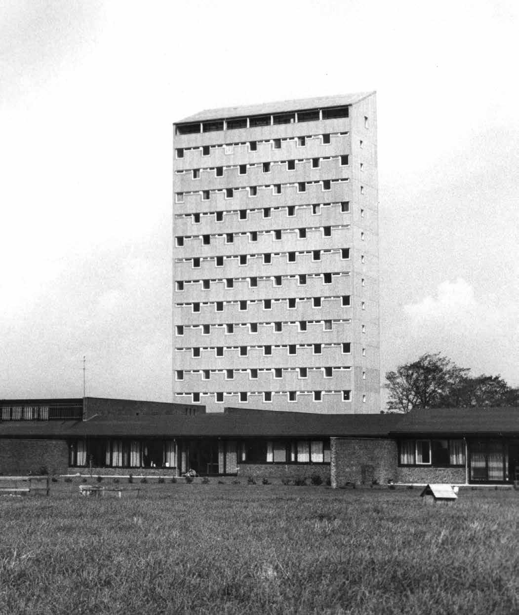 Herning Højskole med det imponerende tårn. Højskolen blev tegnet af arkitekterne Viggo Møller-Jensen og Tyge Arnfred i 1959-62.