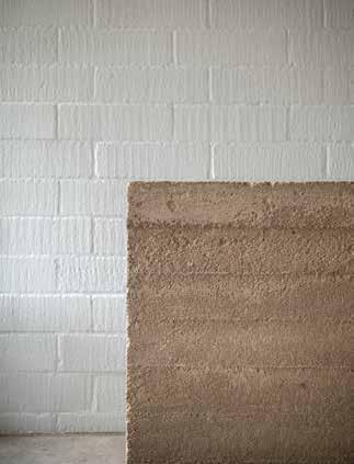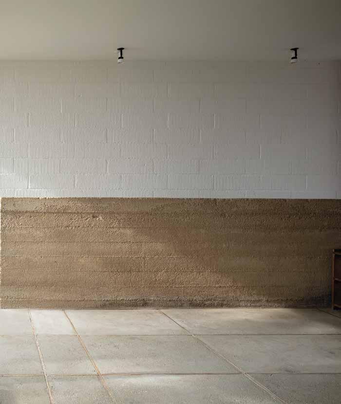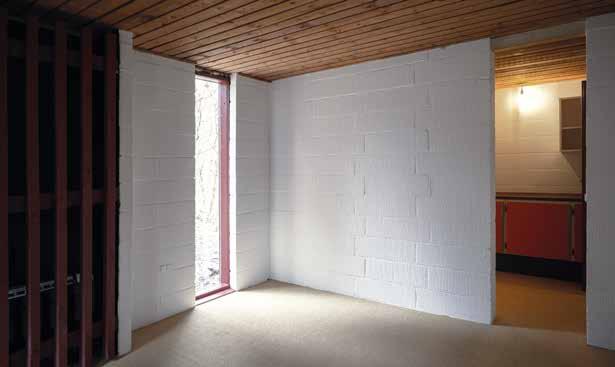 Vægge af præfabrikeret gasbeton strøget med kalk. Et gulv af støbt beton med forskydningslister. En halvmur af in-situstøbt beton med mærker af forskallingsbrædder. Og hertil svenskrødt træværk.