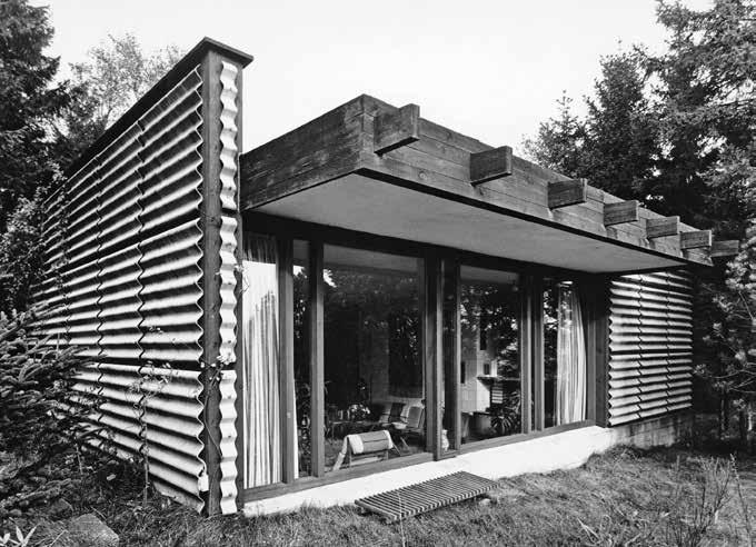Poul Erik Thyrrings hus opføres over et årti. Den konsekvente brug af bølgeeternitplader på et rødt træskelet giver de tre bygningsvolumner et helhedspræg.
